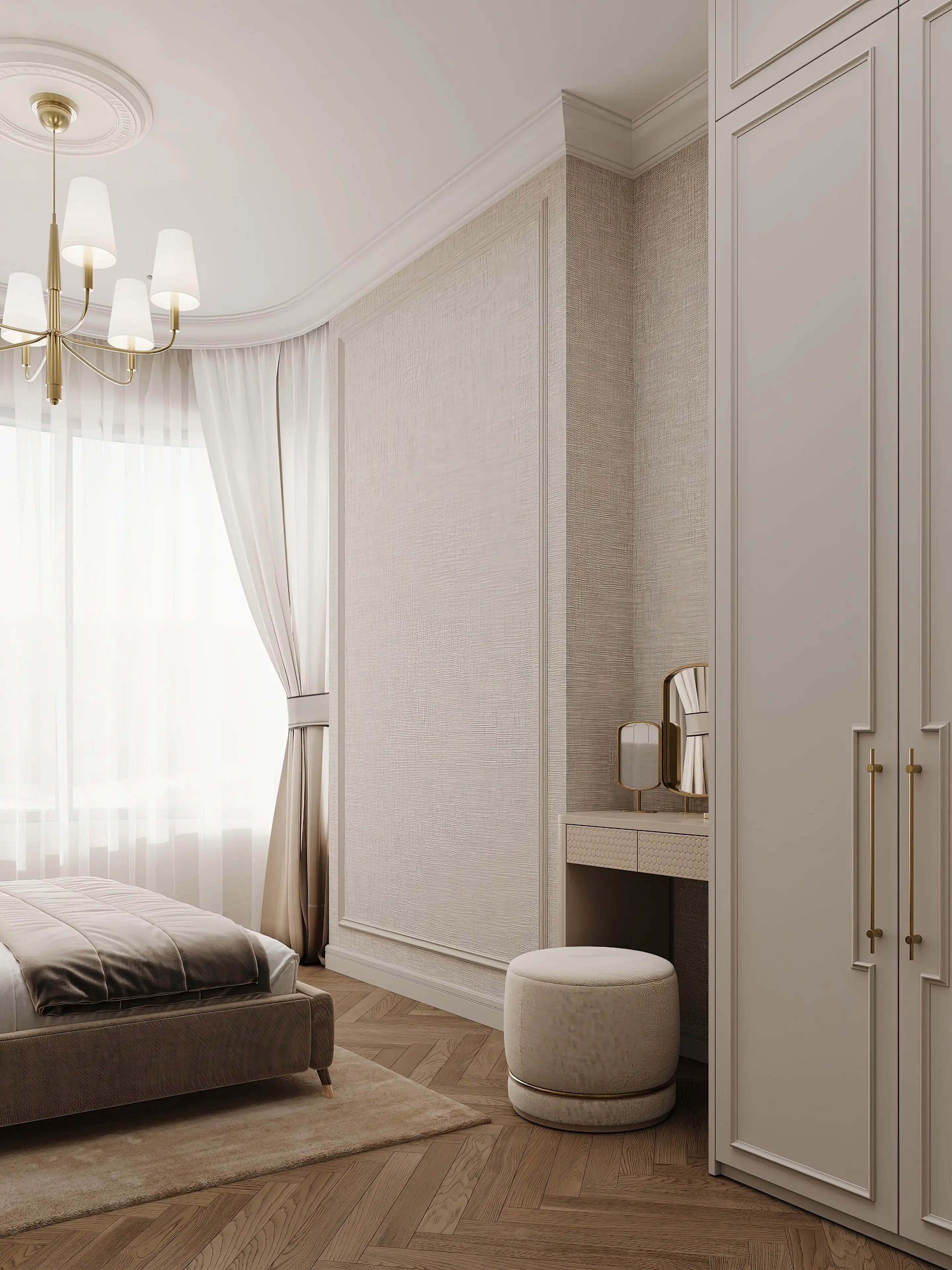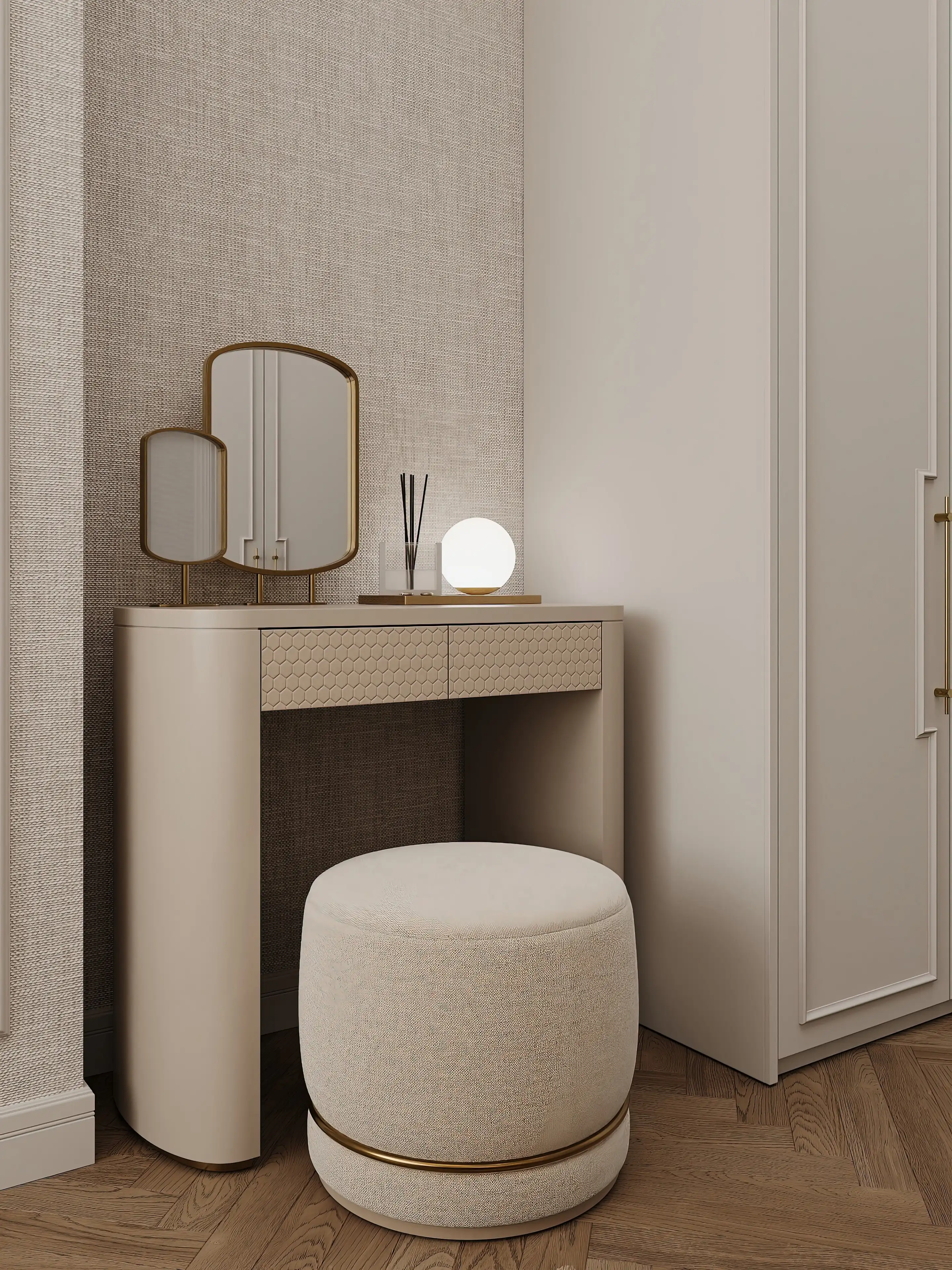 В нише напротив кровати притаился туалетный столик с мягким пуфом — его рельефные фасады с узором «соты» привносят в интерьер тактильную интригу, приглашают прикоснуться к игре текстур. Светло-бежевая гамма, разбавленная благородным сиянием латуни, сплетает все элементы в единую мелодию покоя, создавая пространство, где каждый уголок шепчет о безмятежном отдыхе и душевном равновесии.