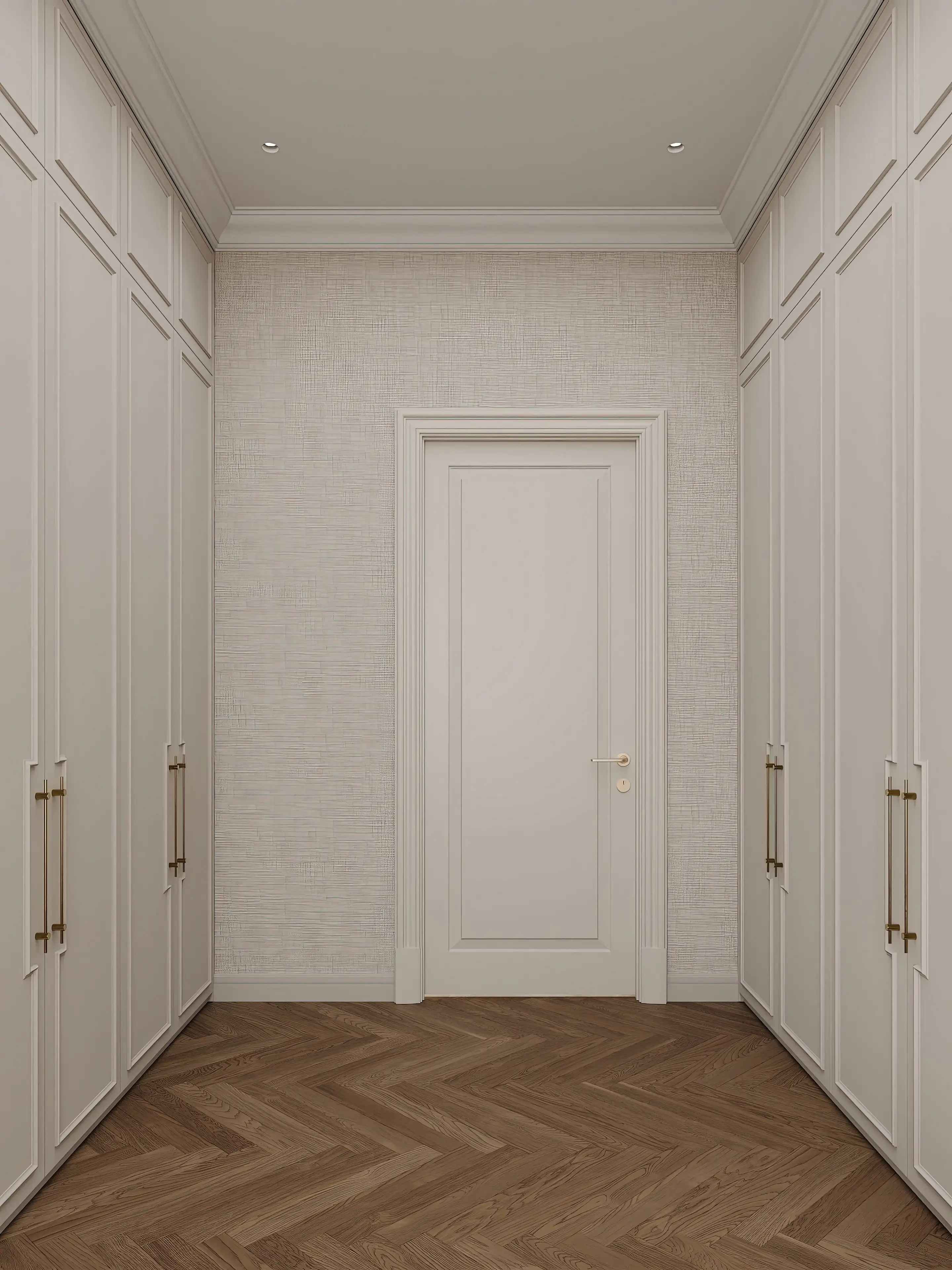 При входе взгляд невольно задерживается на высоких шкафах, которые, будто растворяясь в стенах, хранят в себе тайны упорядоченного быта. Латунные ручки, подобные маленьким солнечным бликам, перекликаются с другими металлическими акцентами интерьера, превращая утилитарные формы в часть единой симфонии пространства.