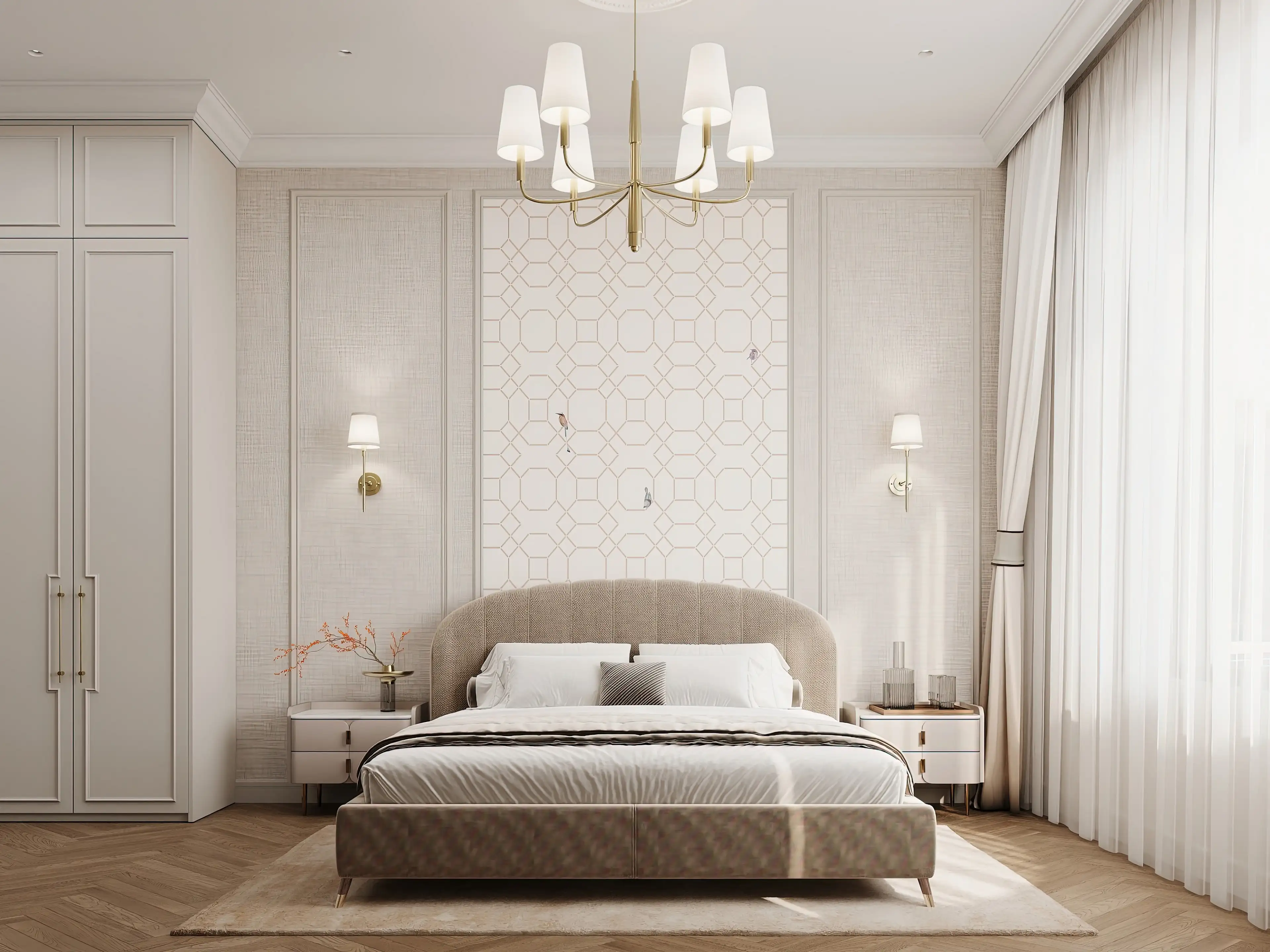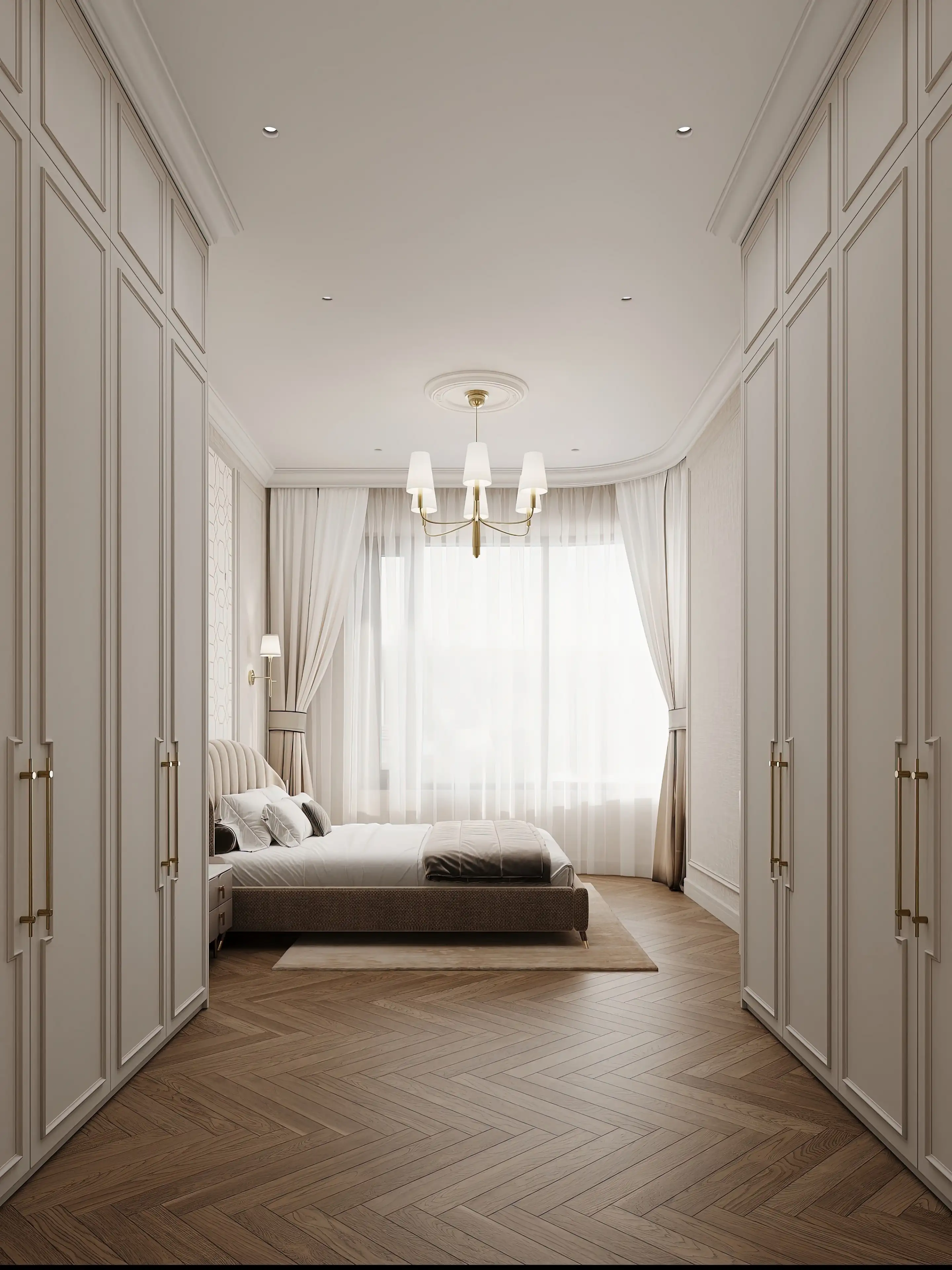 Сердце спальни — светло-коричневая кровать с мягким полукруглым изголовьем, расположившаяся в ласковых лучах оконного света. Её окружают парные прикроватные тумбочки и бра, будто вышедшие из старинной французской усадьбы. Шестилучевая латунная люстра, похожая на люстру в гостиной, и деликатное точечное освещение рождают мягкий, убаюкивающий свет, настраивающий на безмятежный покой.