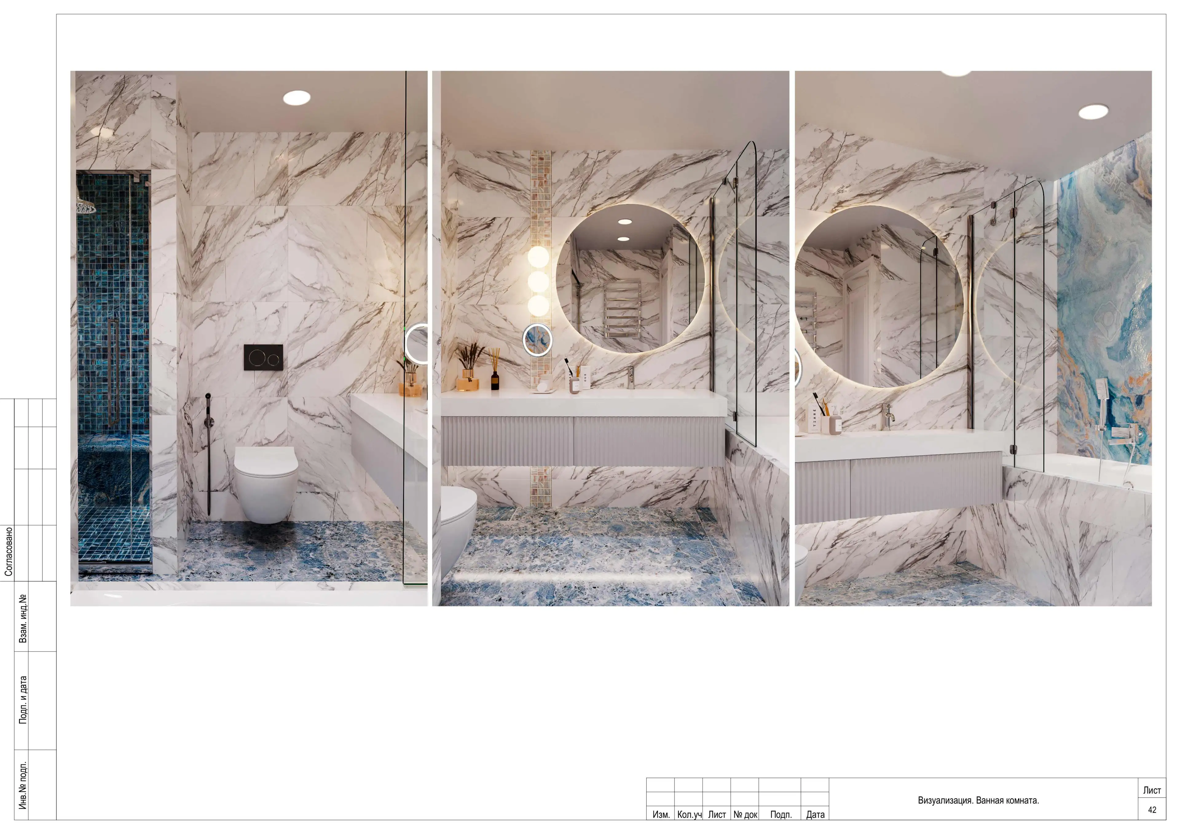 Второй санузел — полноценная ванная с эффектной отделкой. Стены и потолок облицованы белым керамогранитом под мрамор. Благодаря широкому зеркалу, стеклянным перегородкам, LED-подсветке и изящным подвесным светильникам в виде золотых капель всё пространство сияет и искрится.