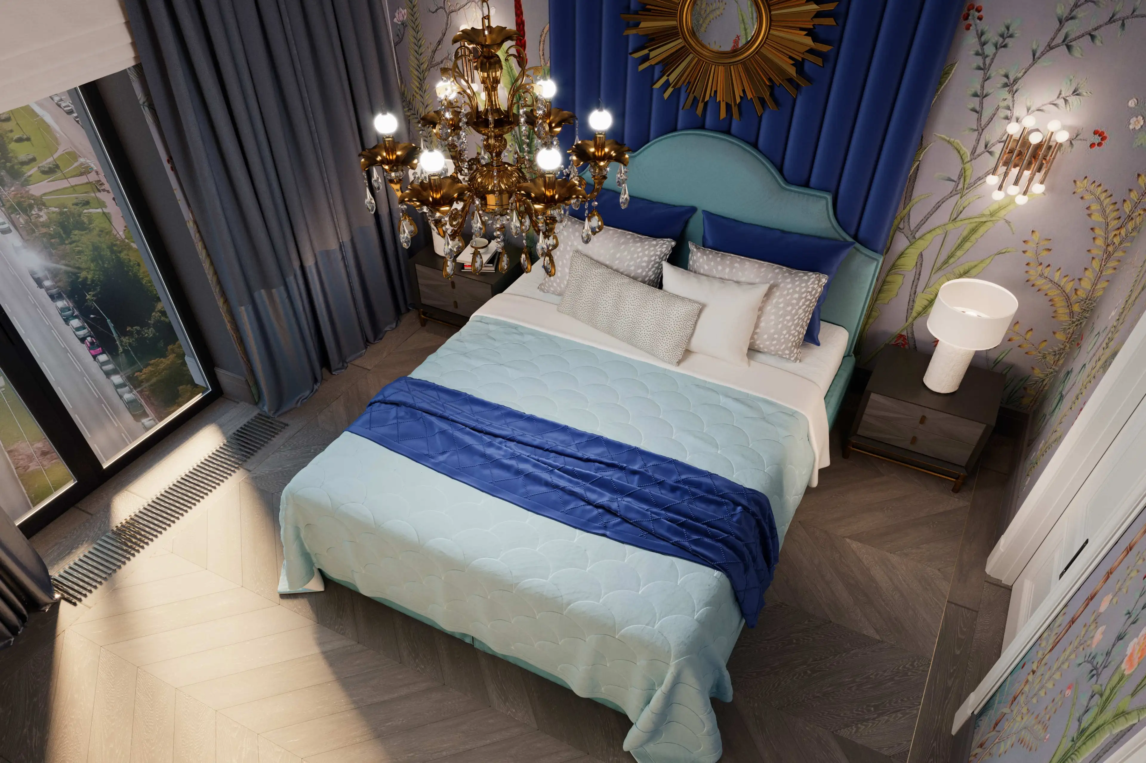 Собственно, в спальне даже нет мебели помимо кровати и прикроватных тумбочек — наличие просторной гардеробной позволило максимально разгрузить комнату. Она создана исключительно для отдыха и медитативного созерцания городской жизни. За окном все куда-то торопятся, а здесь лишь любящие супруги, которые многое прошли вместе и знают цену умиротворению. Даже кровать здесь как маленький отдельный мирок: за роскошным изголовьем стена облицована бархатной 3D-панелью, а на ней сияет символическое солнце с зеркальным центром. Дополняет композицию классическая люстра, сверкающая хрусталём и золотом, парные бра ей под стать и белые настольные лампы на элегантных тумбочках.