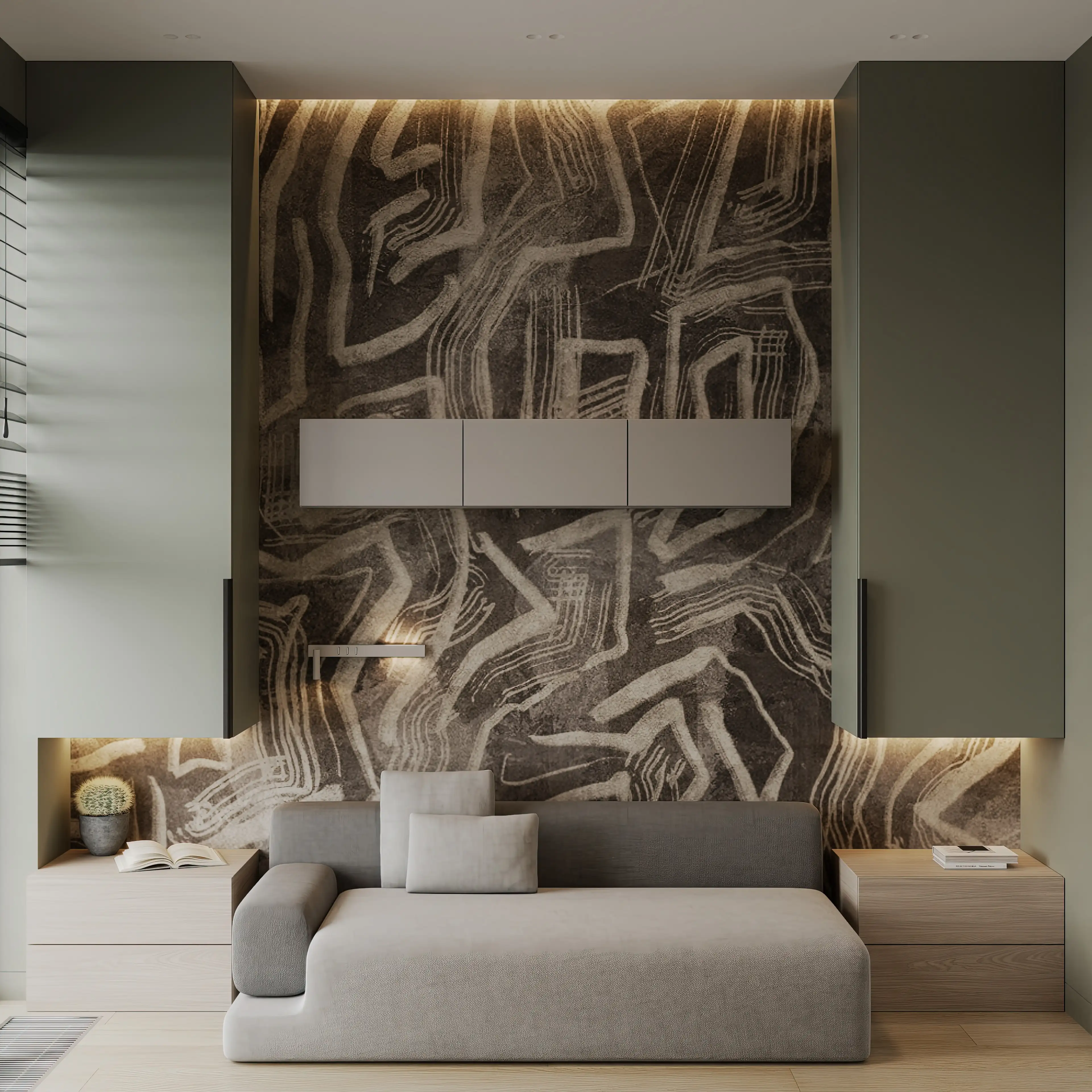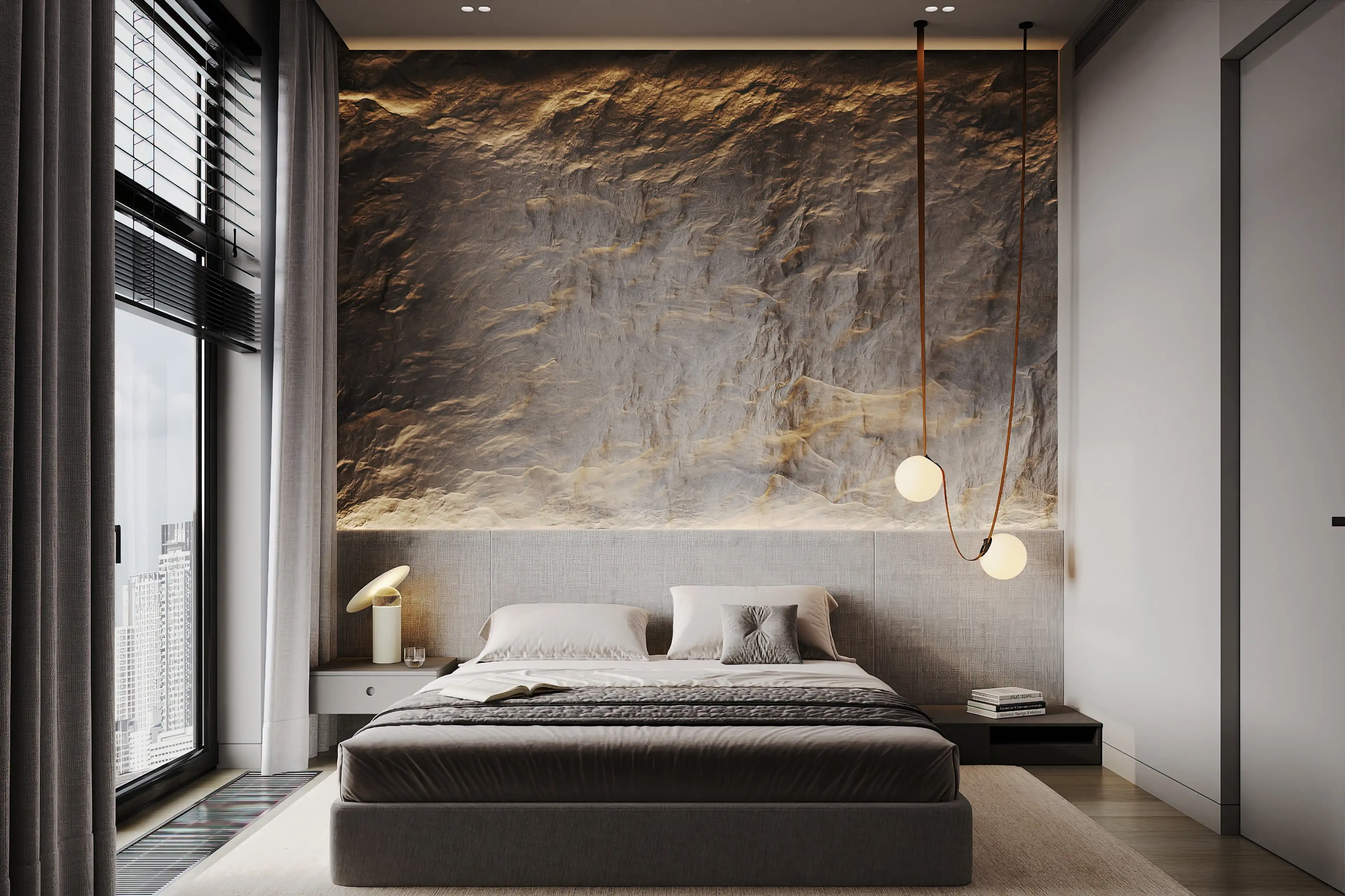 Главный акцент в спальне — фактурная стена за изголовьем кровати, имитирующая натуральный камень. Подсветка по верхнему и нижнему краям эффектно подчёркивает рельеф поверхности. Панорамное окно с горизонтальными жалюзи обеспечивает максимум естественного света.