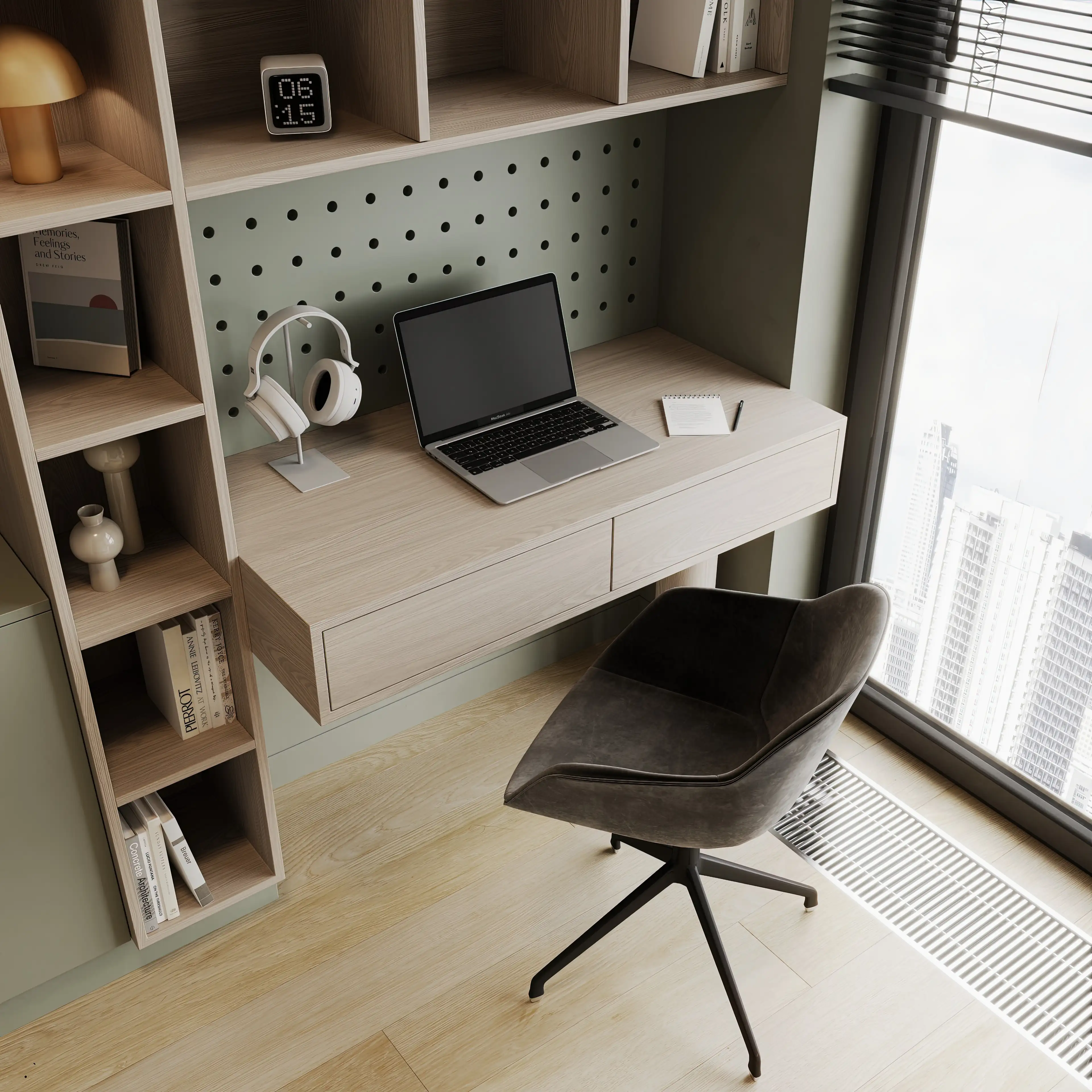 Открытые и закрытые полки вдоль стены позволяют хранить книги и аксессуары, поддерживая порядок и визуальную лёгкость.