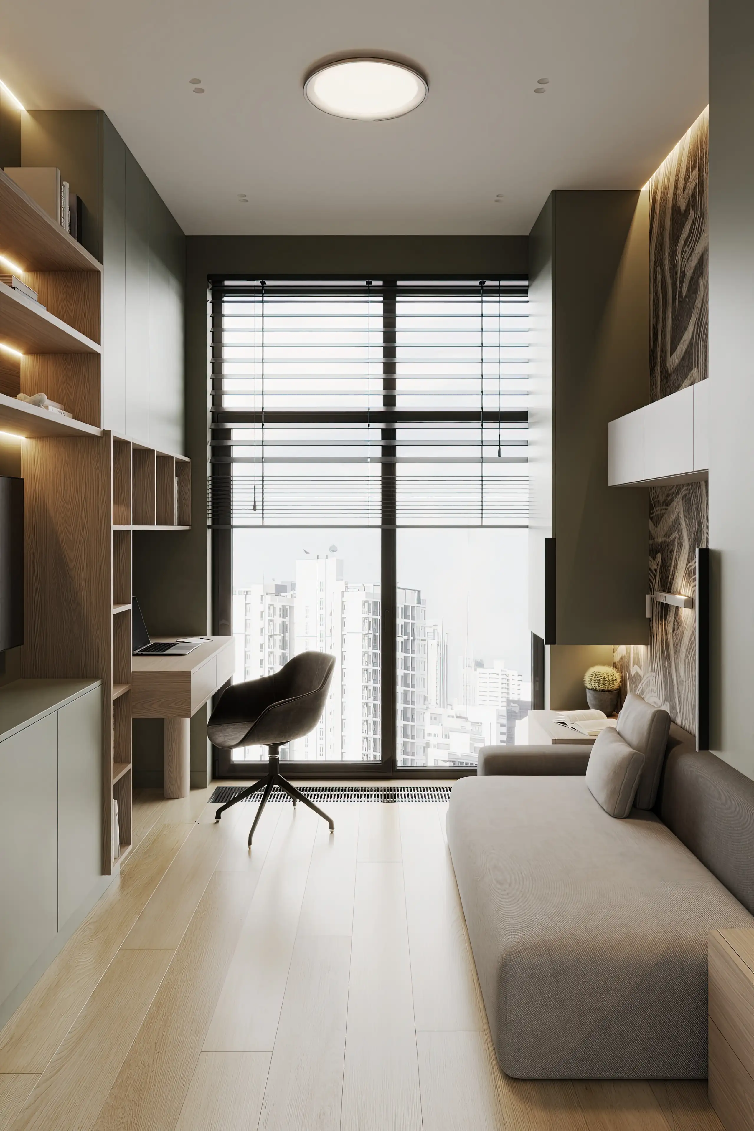 У окна размещено рабочее место с небольшим письменным столом и эргономичным креслом. Большое окно обеспечивает отличное естественное освещение для продуктивной деятельности.