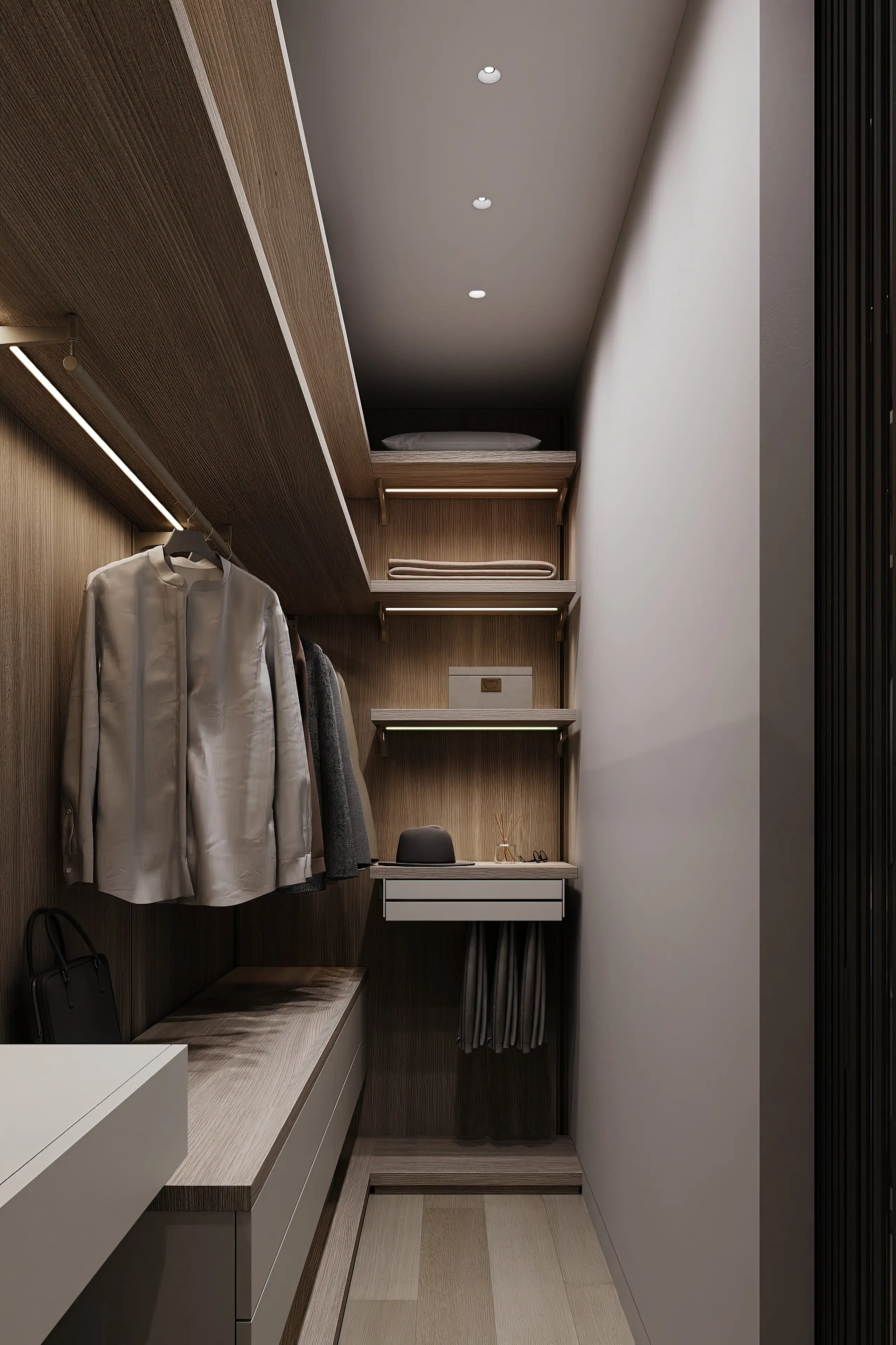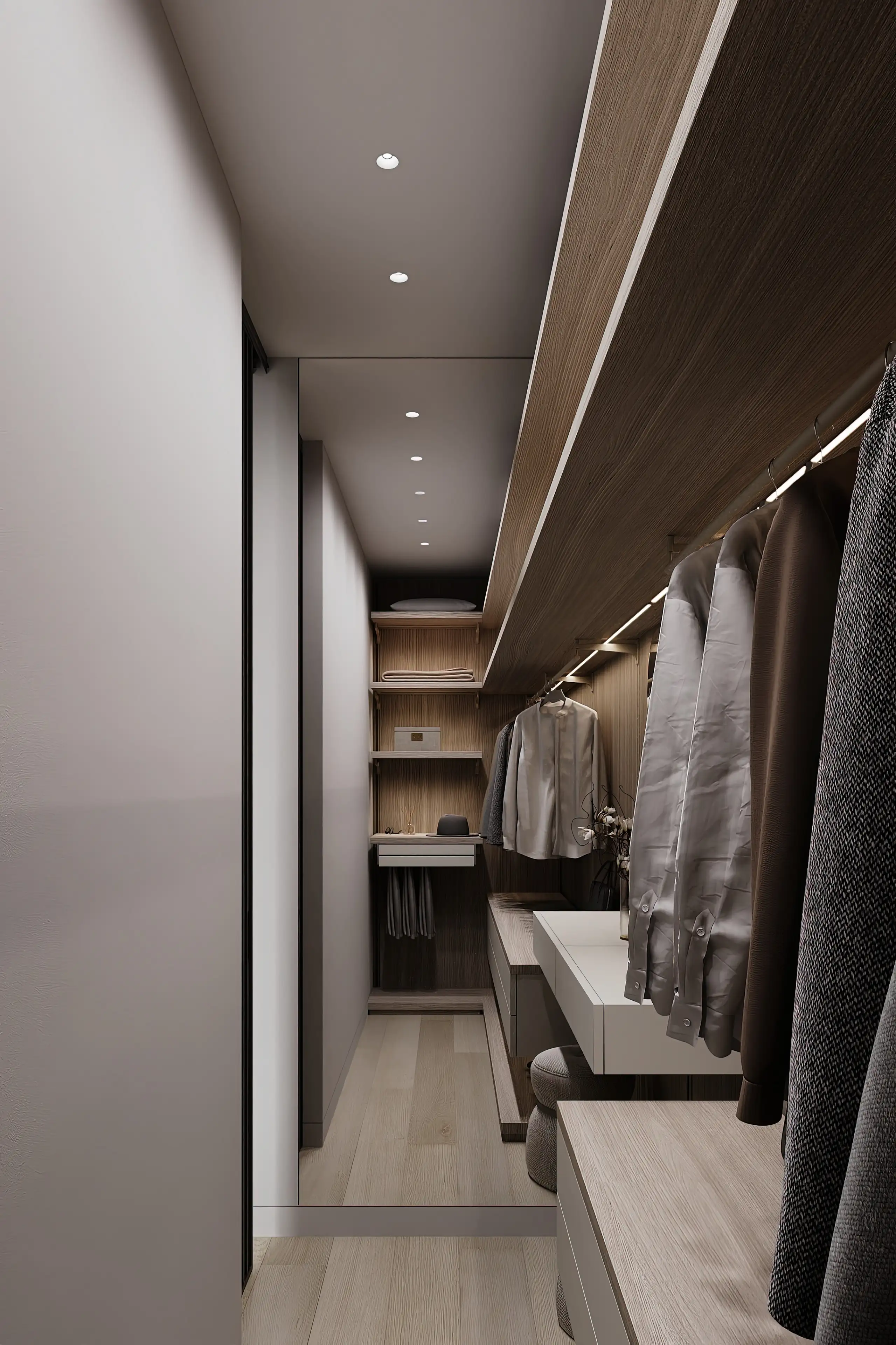 В отделке гардероба преобладают светлое дерево и матовые поверхности — это помогает визуально увеличить пространство. Монохромная палитра поддерживает ощущение порядка.