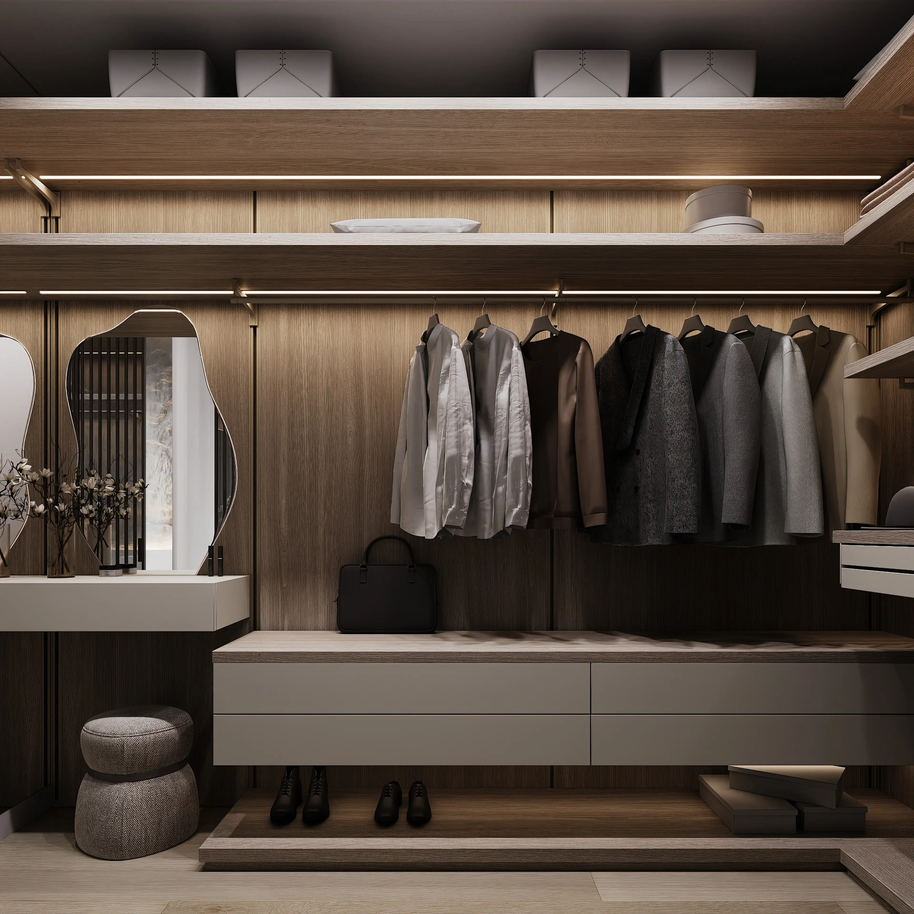 Встроенная подсветка секций превращает гардеробную в удобное и красивое пространство. Свет мягкий и рассеянный, что облегчает навигацию и защищает текстиль от выцветания.