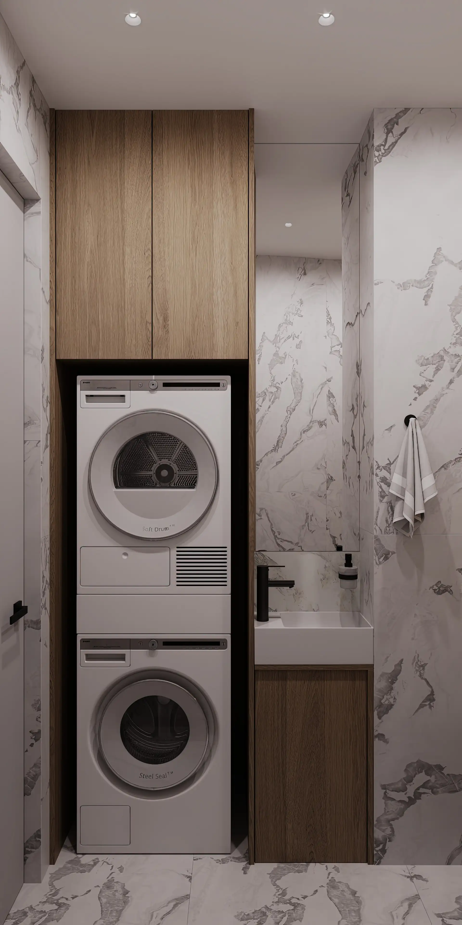 Функционально этот санузел одновременно является прачечной. Светлый керамогранит зрительно расширяет узкое помещение. Компактная раковина с тумбой экономит место.
