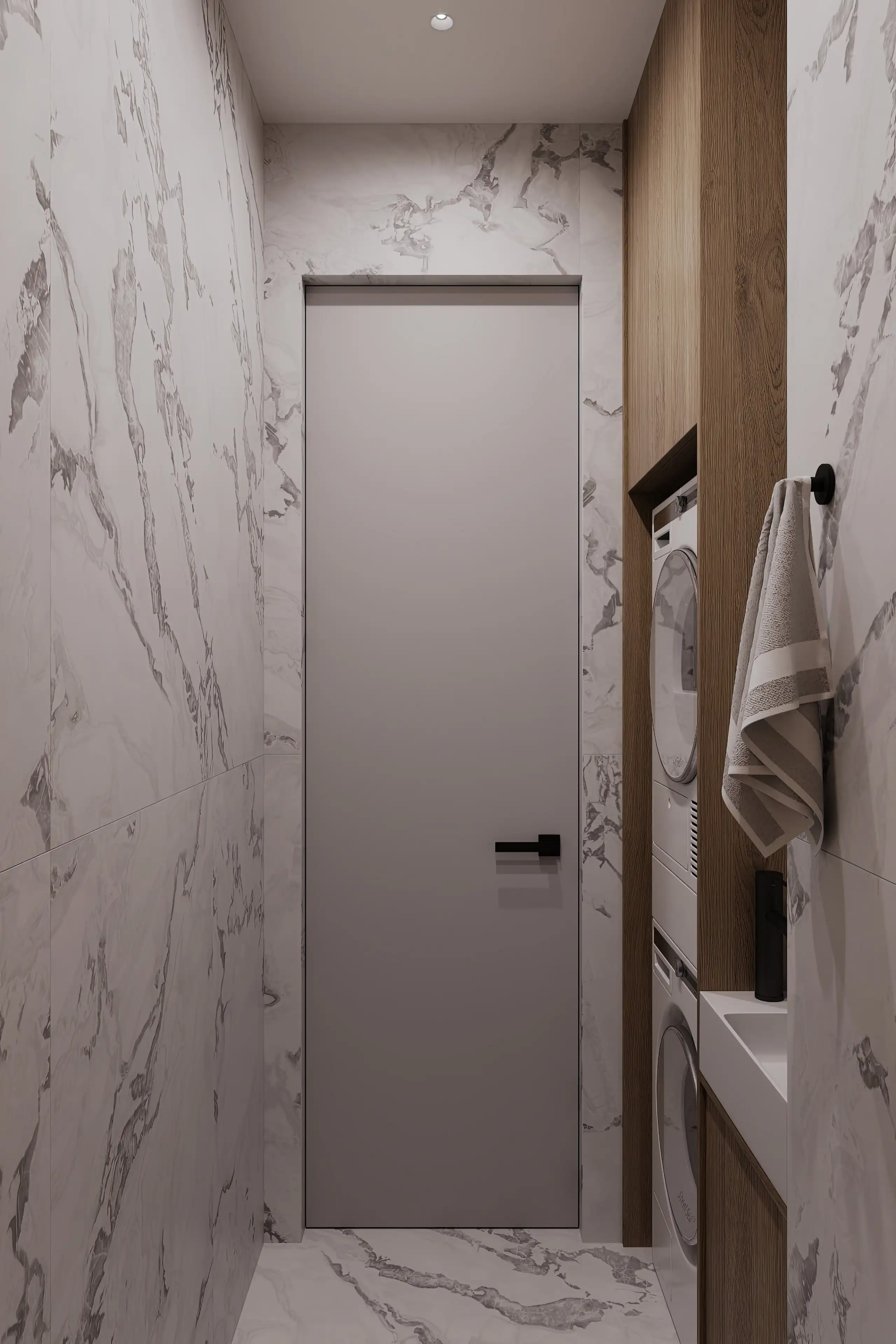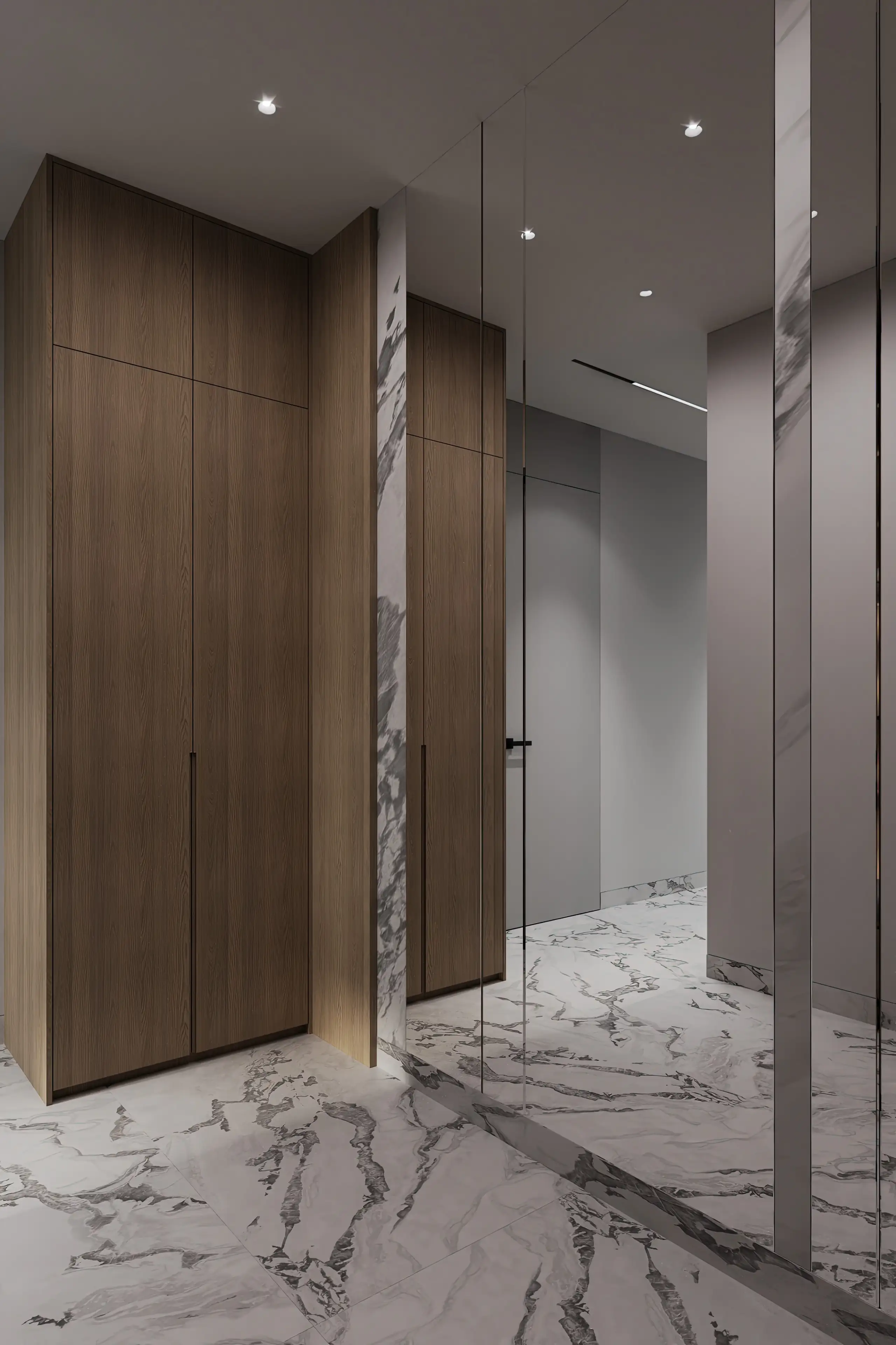 Пол и декоративные элементы стен выполнены из белого керамогранита с тёмно-серыми прожилками, что придаёт интерьеру элегантность. Большие зеркала добавляют света даже при отсутствии окон.
