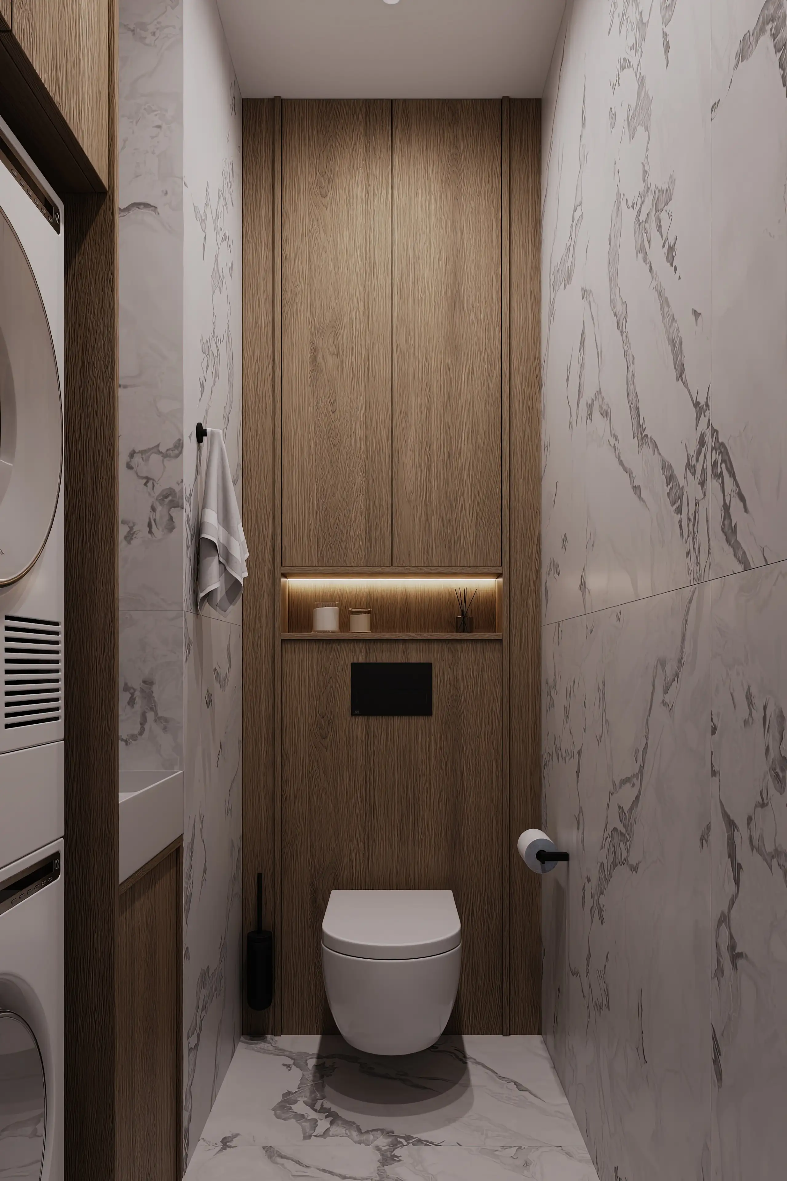 Гостевой санузел компактный, поэтому каждое решение должно быть практичным. Унитаз — подвесной. Для косметических средств и других мелочей предусмотрена ниша с подсветкой.