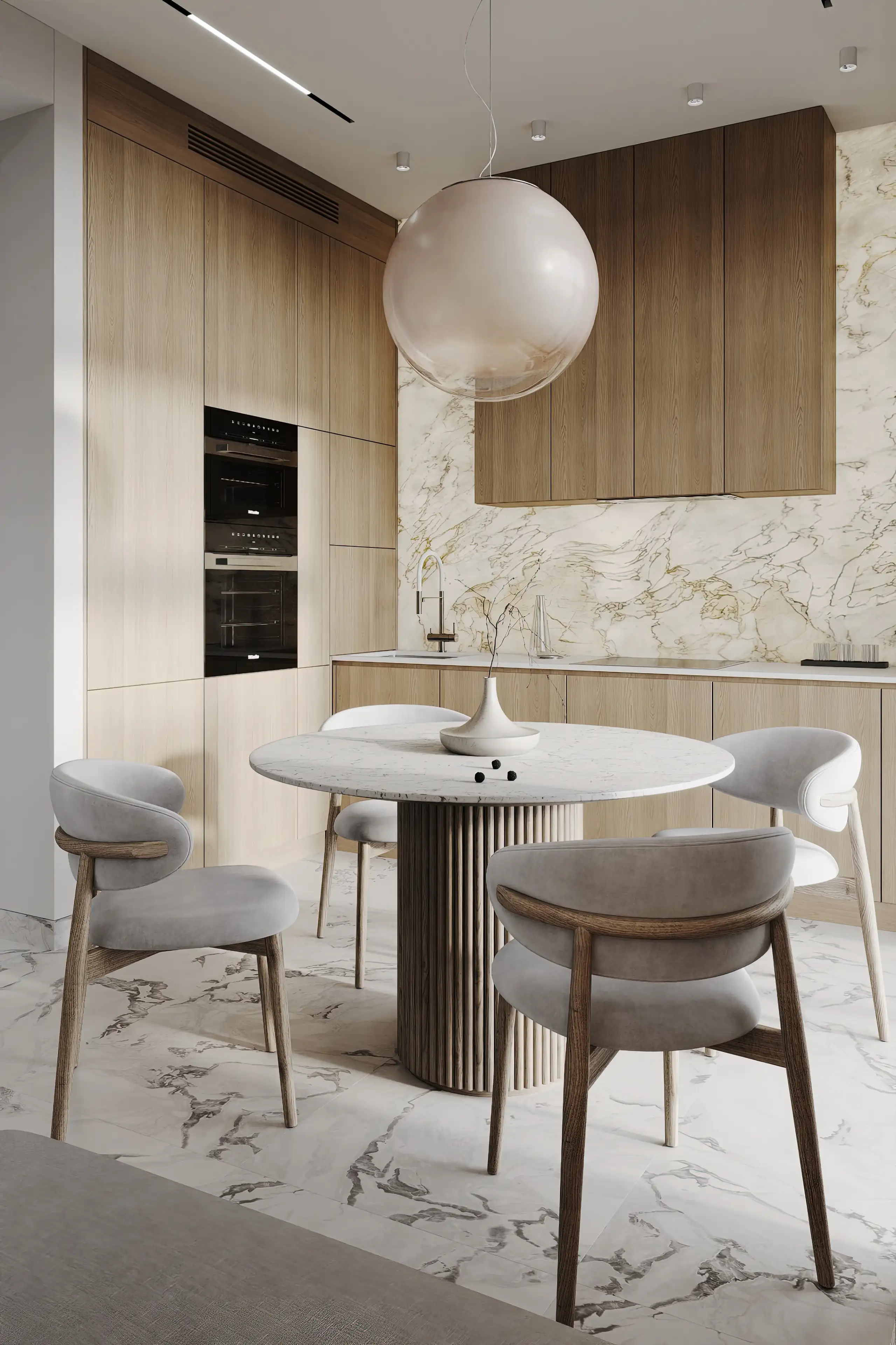Кухня объединена со столовой зоной и гостиной, что создает ощущение открытости и простора. Кухонные фасады из светлого дерева не перегружают пространство, а обеденная группа с мягкими стульями добавляет уюта и плавности линий.