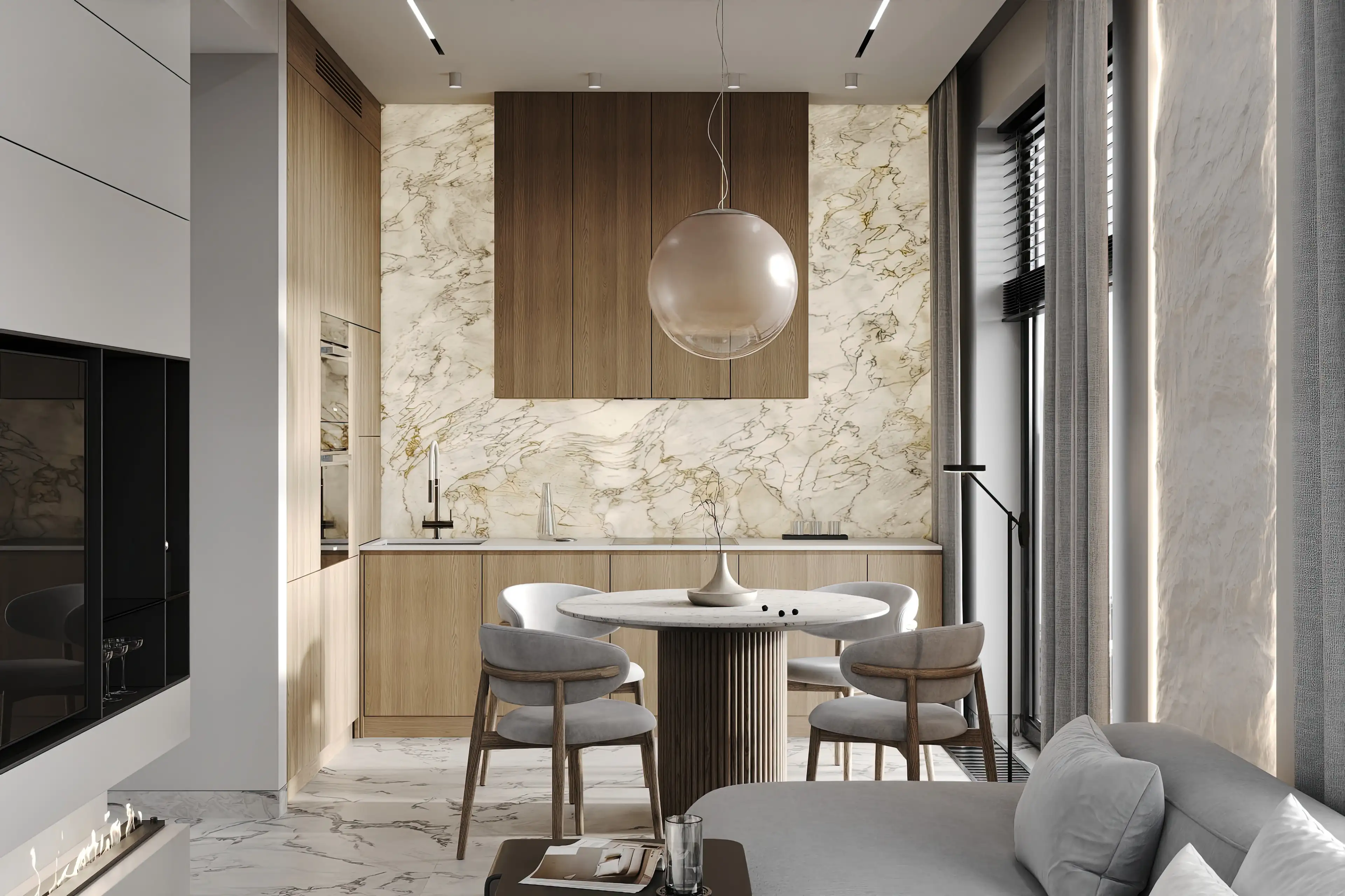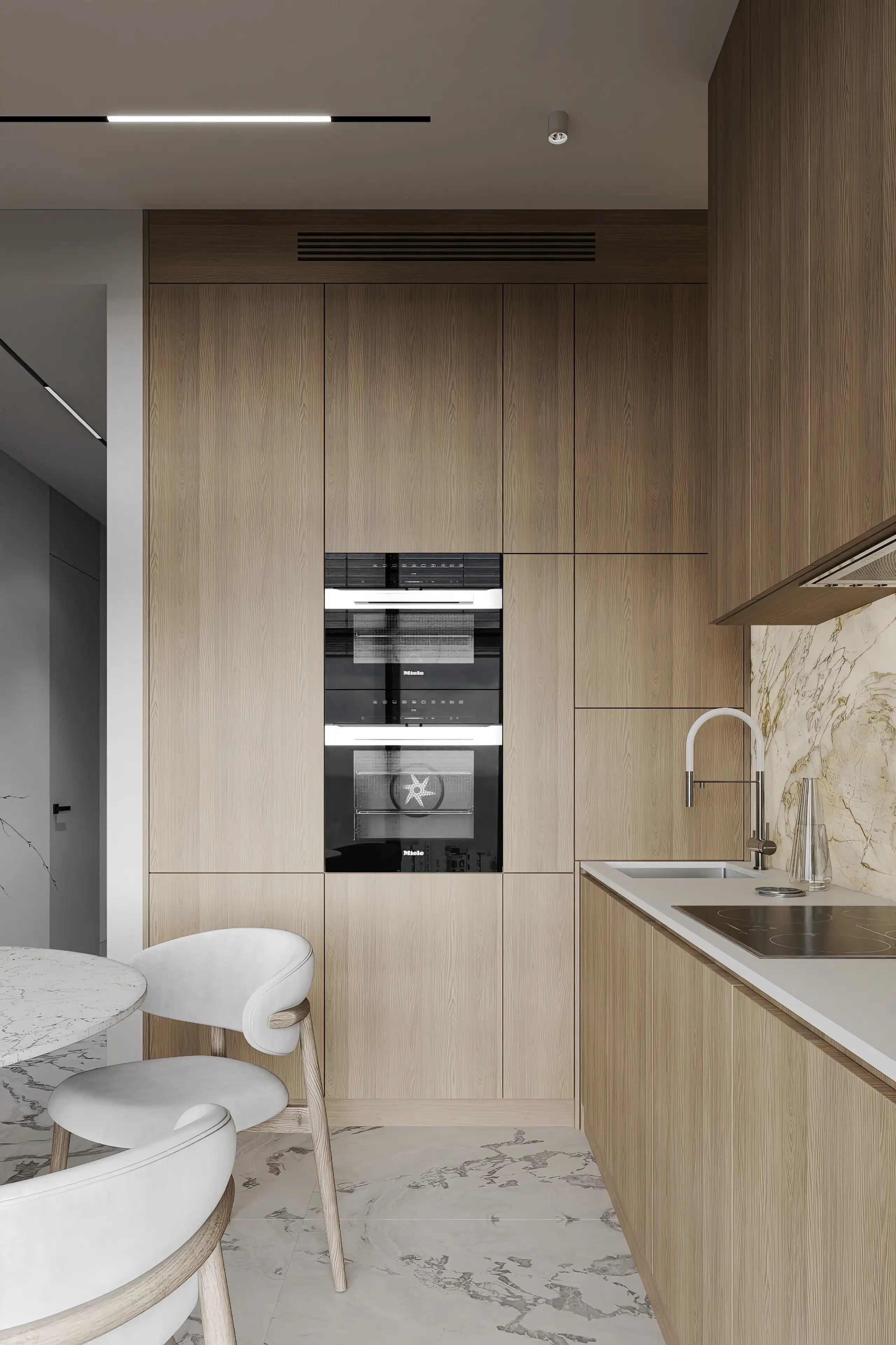 Доминирующая палитра - тёплые и нейтральные тона. Мрамор на стенах и на полу обеспечивает визуальное единство поверхностей. Фасады верхних шкафов имеют более насыщенный оттенок, что создаёт глубокий и гармоничный контраст.