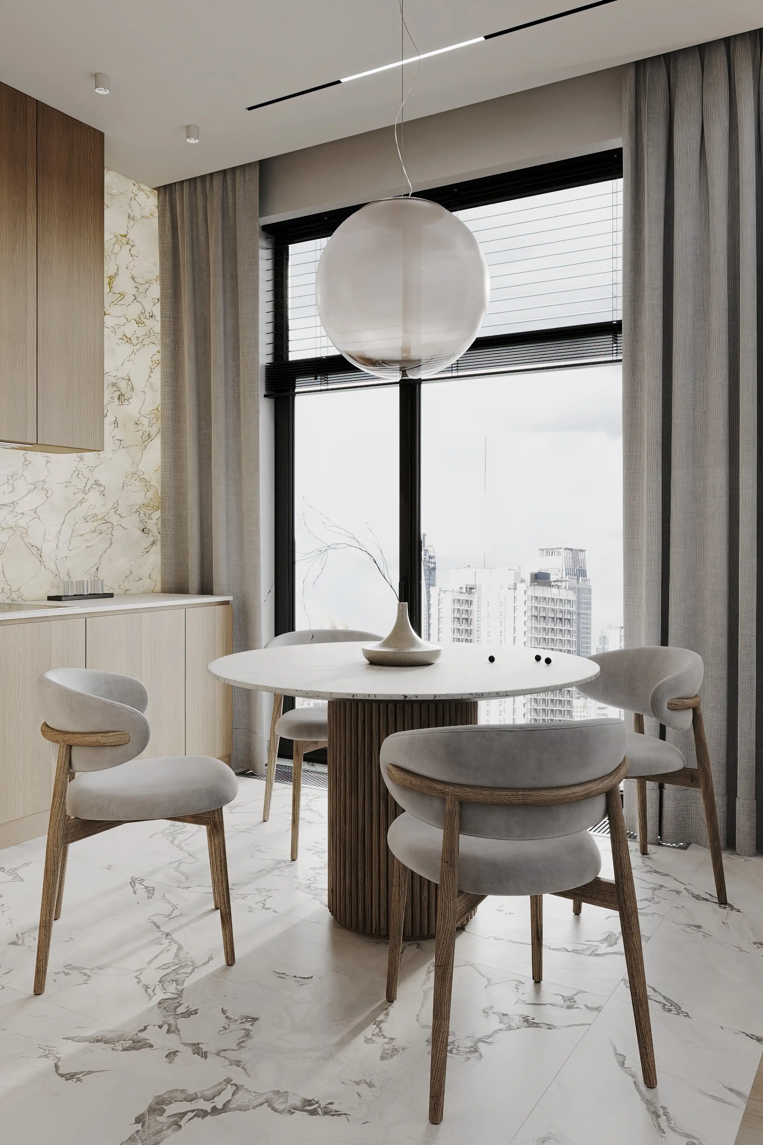 Подвесной шарообразный светильник над обеденным столом становится стильным акцентом. Встроенные световые линии и напольный торшер у окна обеспечивают функциональный свет.