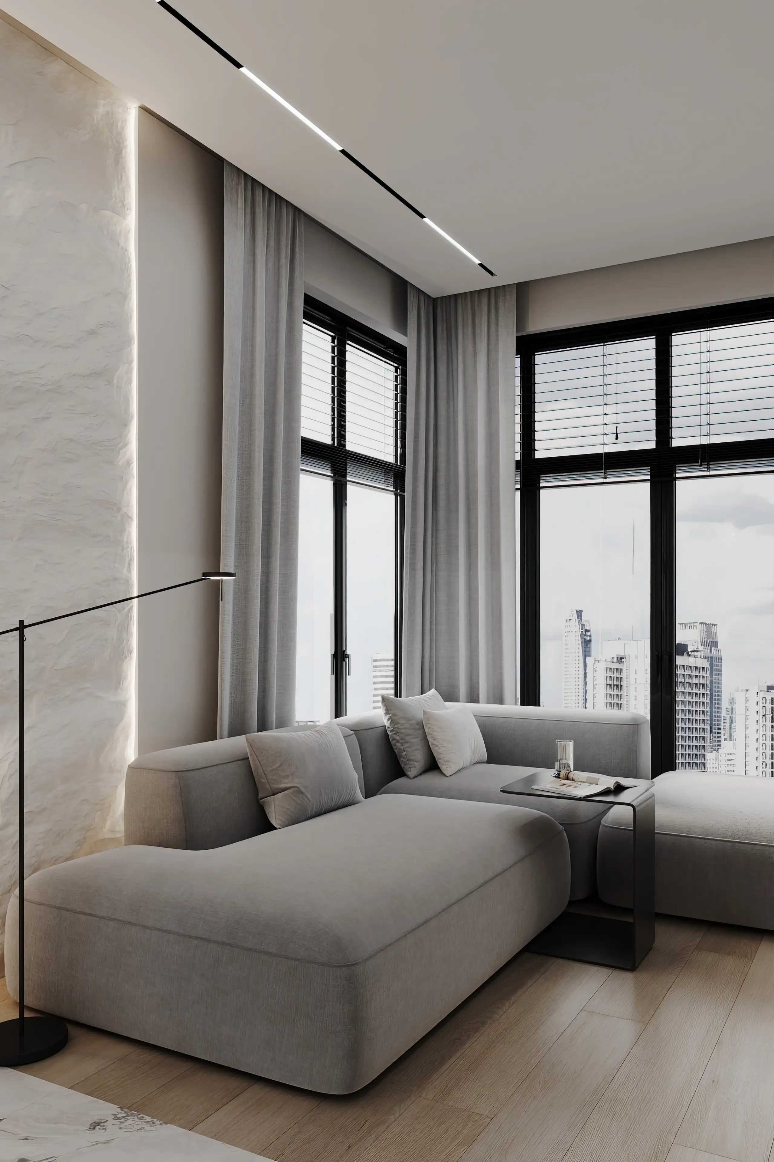 Основная цветовая гамма гостиной состоит из нейтральных оттенков серого. Интерьер выглядит респектабельно, но не холодно благодаря сочетанию естественного освещения и тактильно приятных текстур.