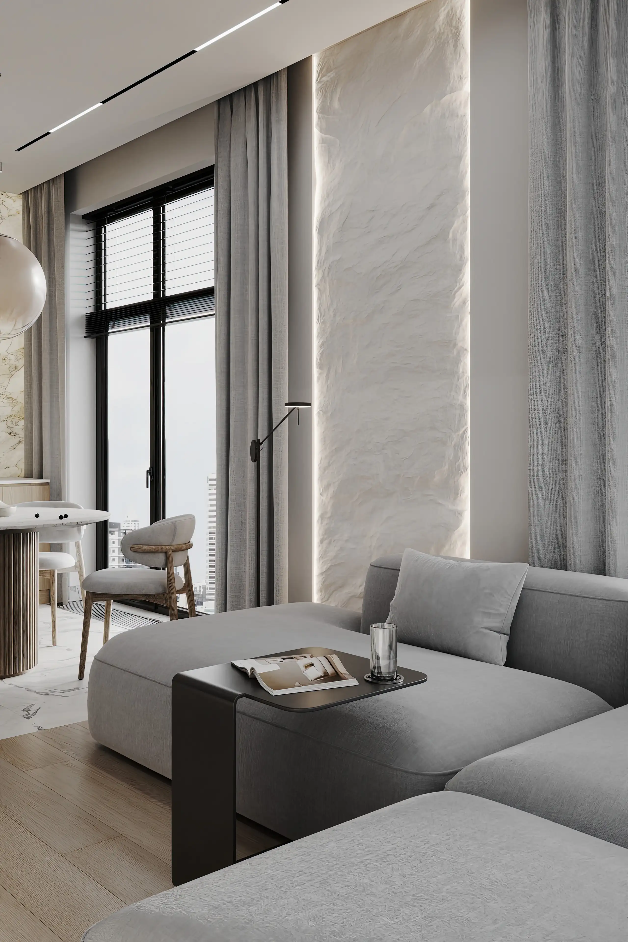 Стеновая панель с фактурой натурального камня подсвечена по контуру, что создаёт эффектную игру света и тени. Естественный свет проникает через большие окна, украшенные однотонными шторами.