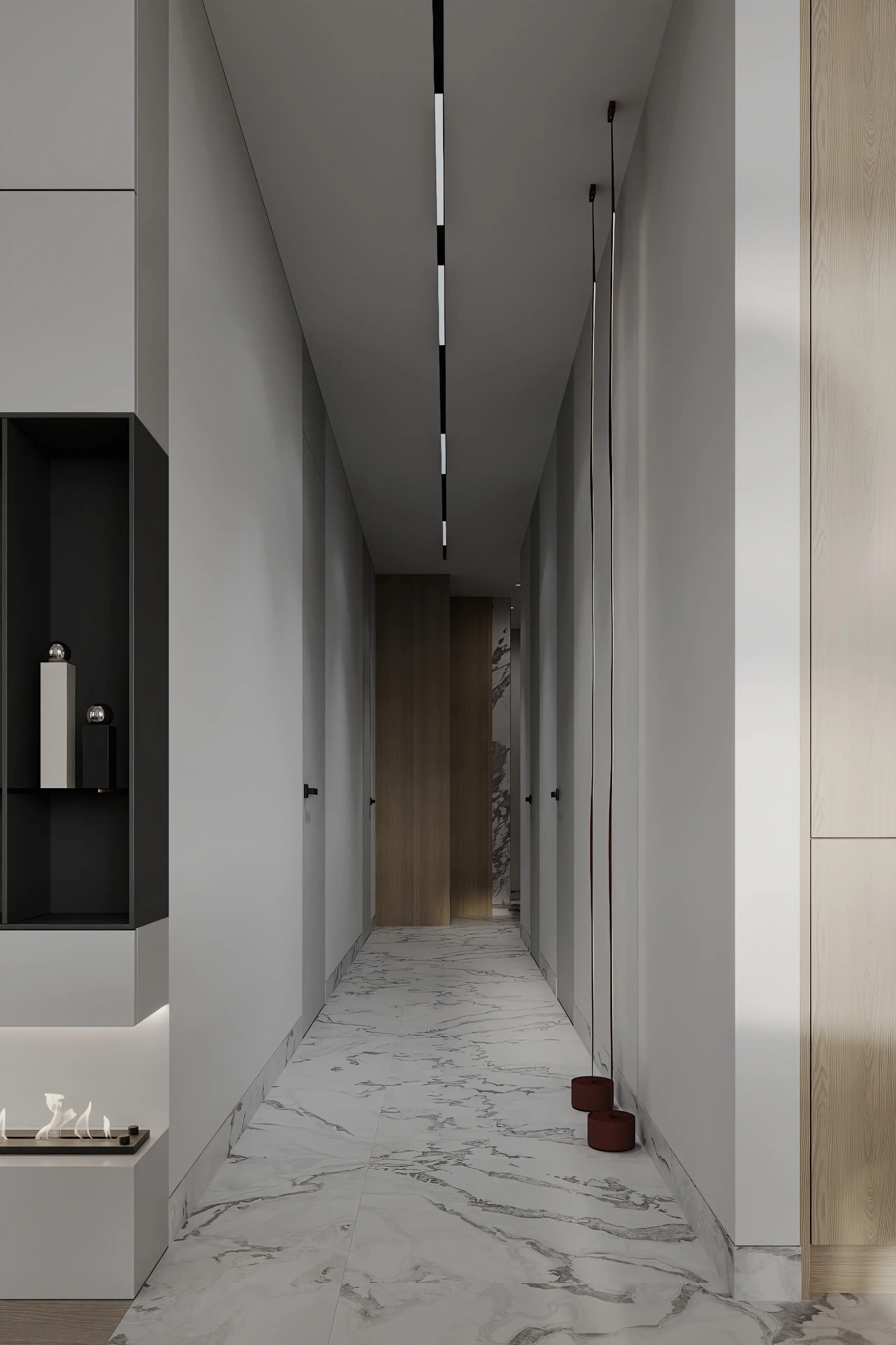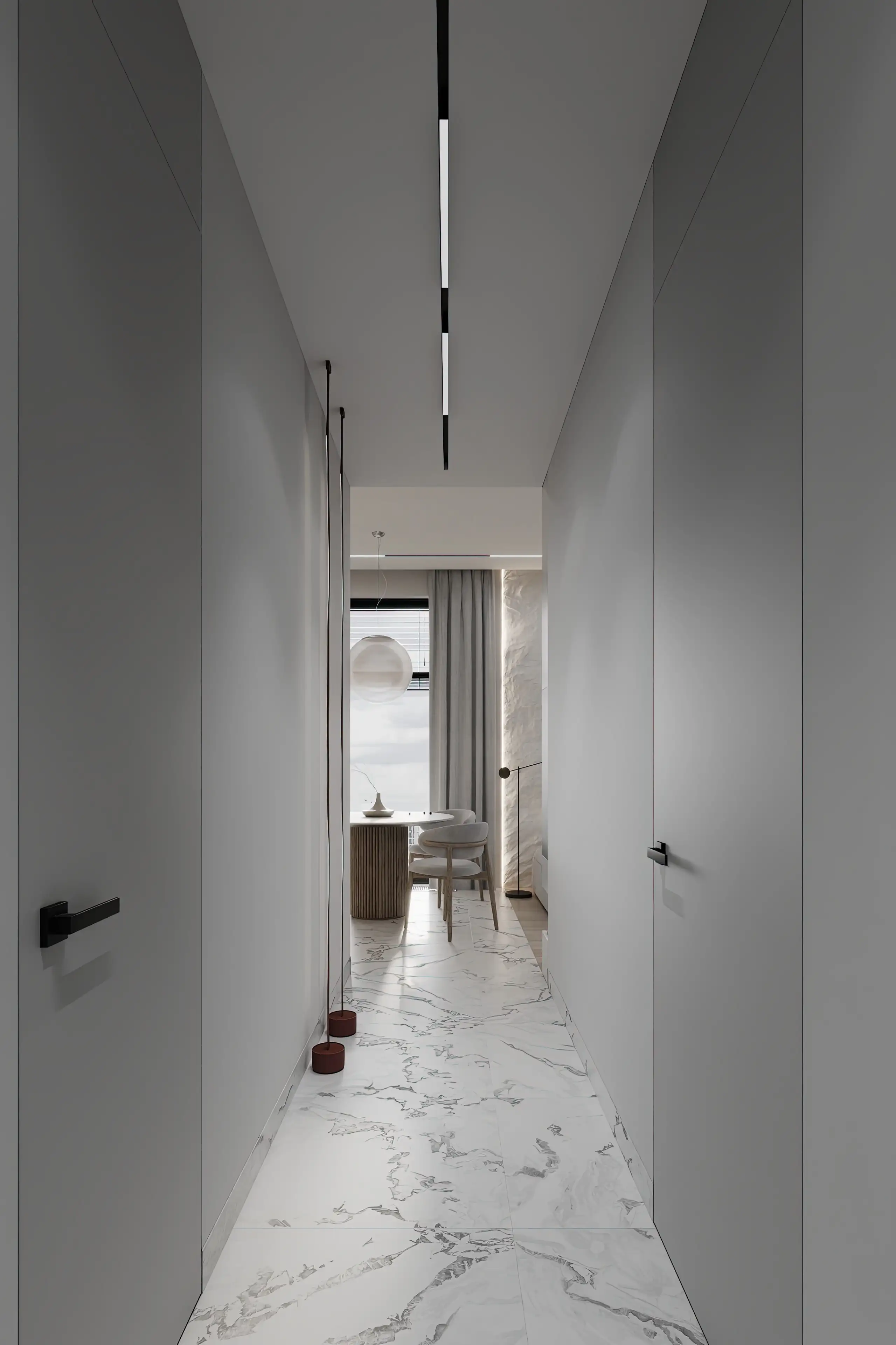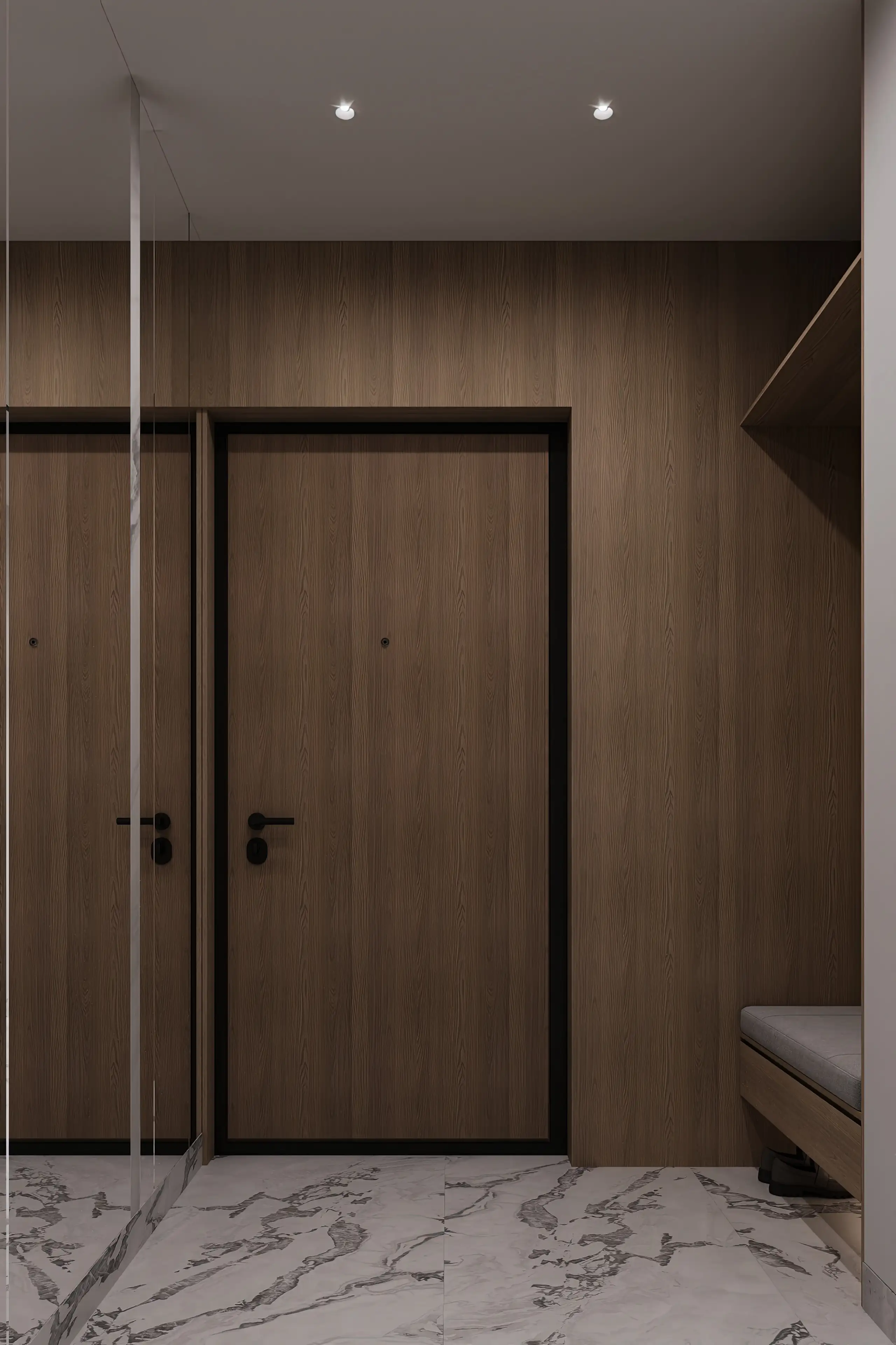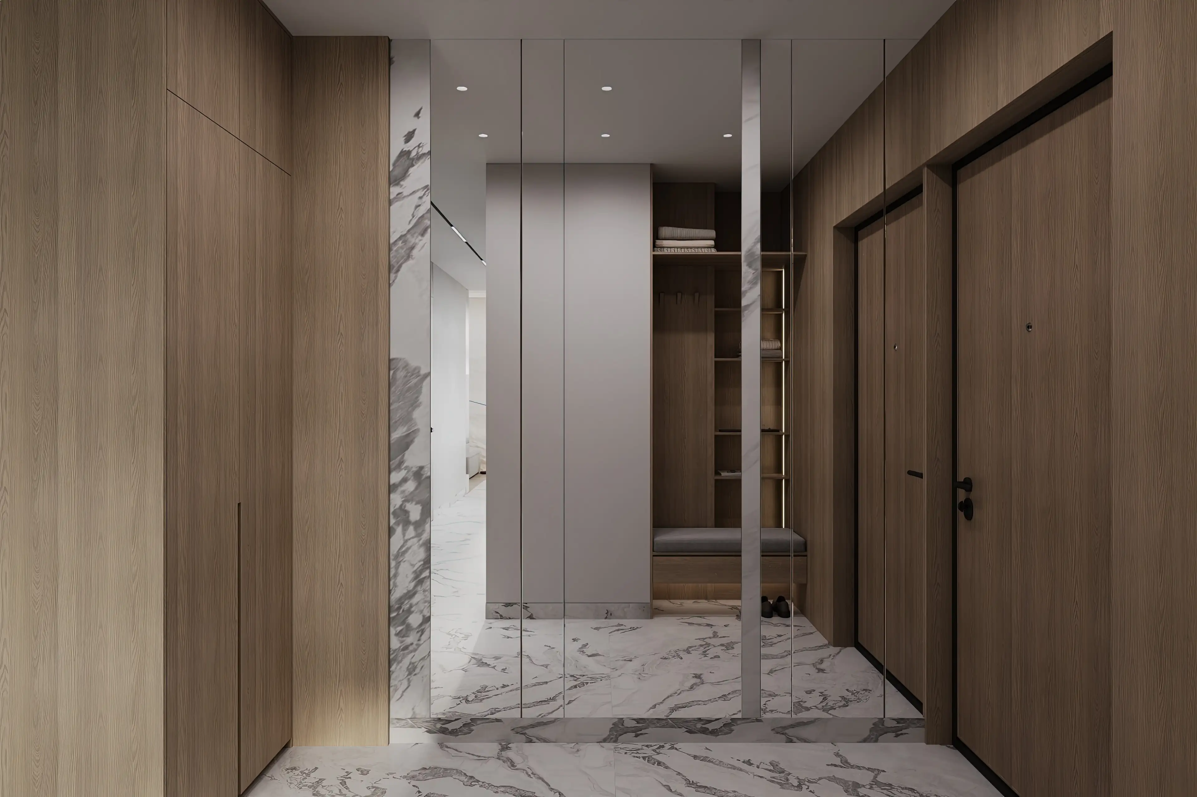 Цветовая гамма и материалы визуально связывают прихожую с остальными помещениями, обеспечивая целостность пространства.