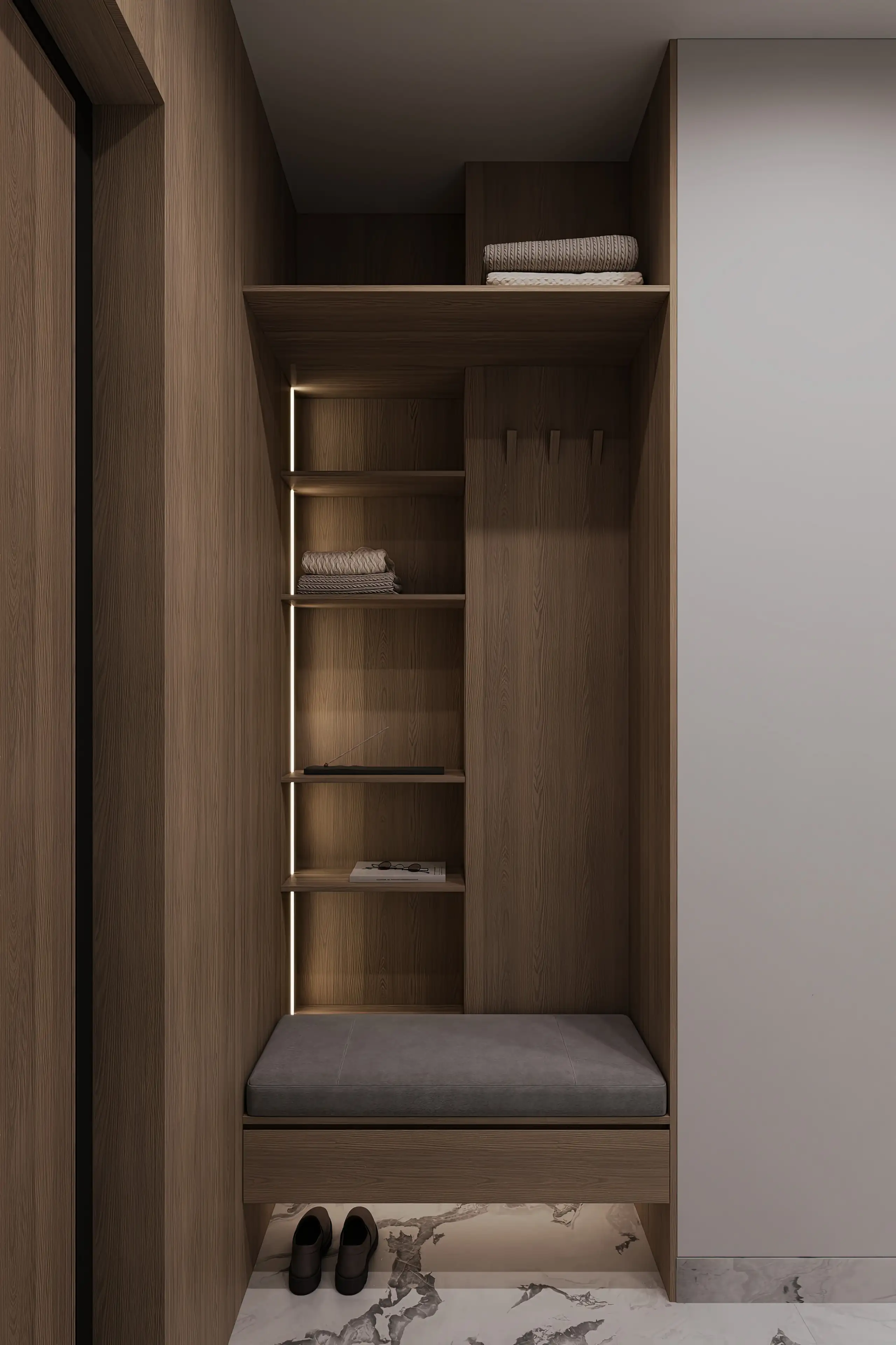 Встроенные шкафы и открытая система хранения обеспечивают достаточно места для одежды и аксессуаров. Небольшая зона с мягкой скамьей позволяет удобно переобуваться.