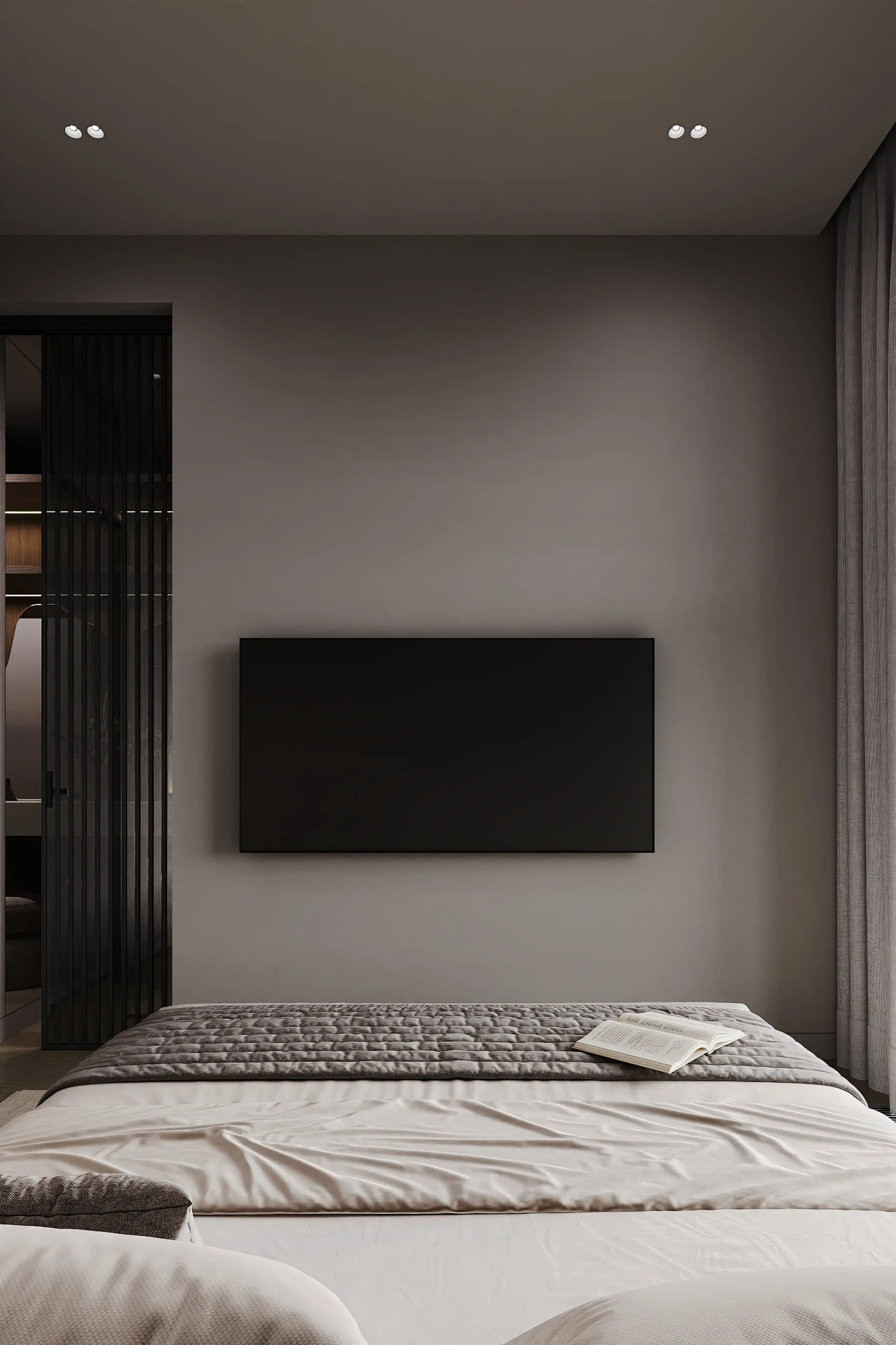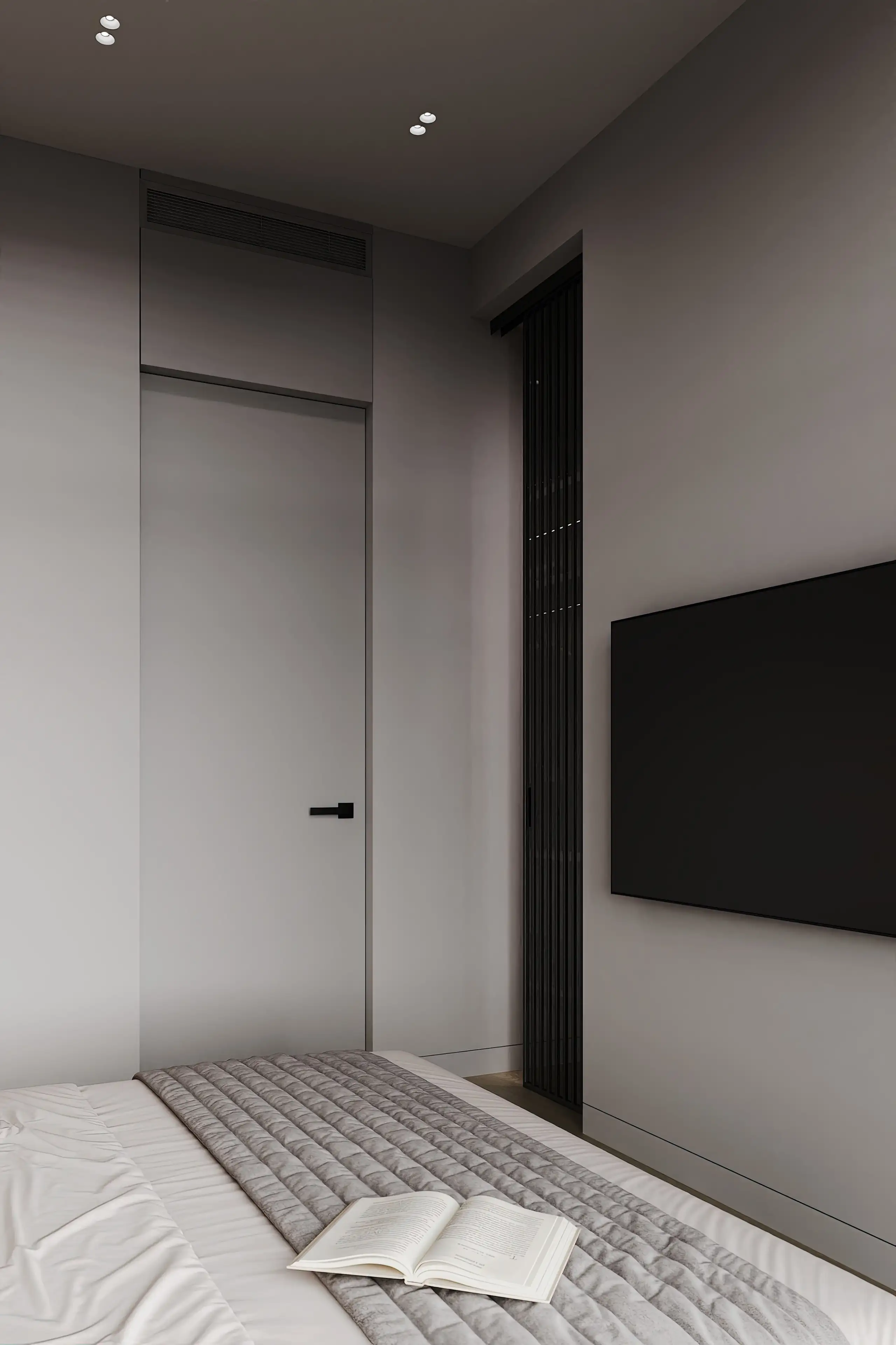 Вход в гардеробную прикрыт чёрной раздвижной полупрозрачной дверью, которая создаёт изысканный акцент и стильно сочетается с телевизионной панелью, органично вписывая её в интерьер.