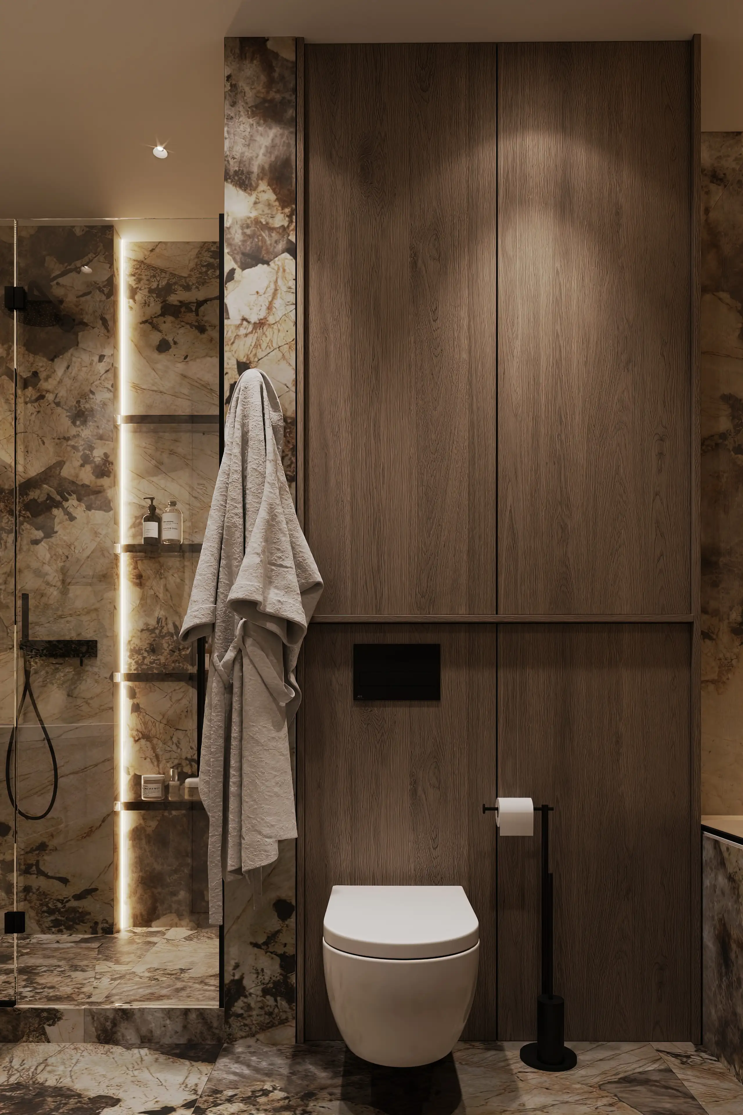 Ниши с подсветкой в душевой зоне позволяют удобно разместить нужные мелочи. Фактура стен в сочетании с дверцами шкафов из древесного шпона привносит в пространство элегантность и природную теплоту.