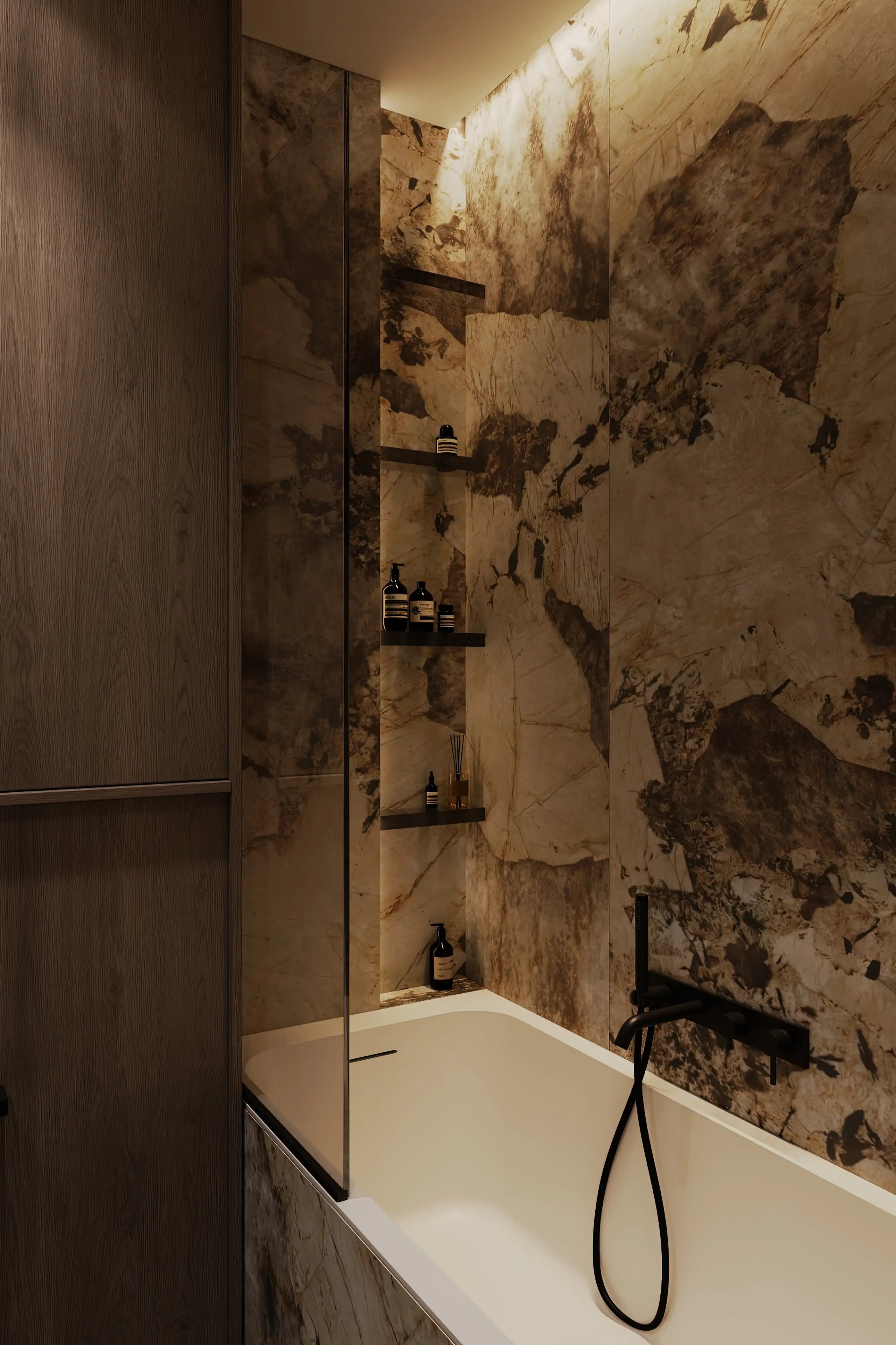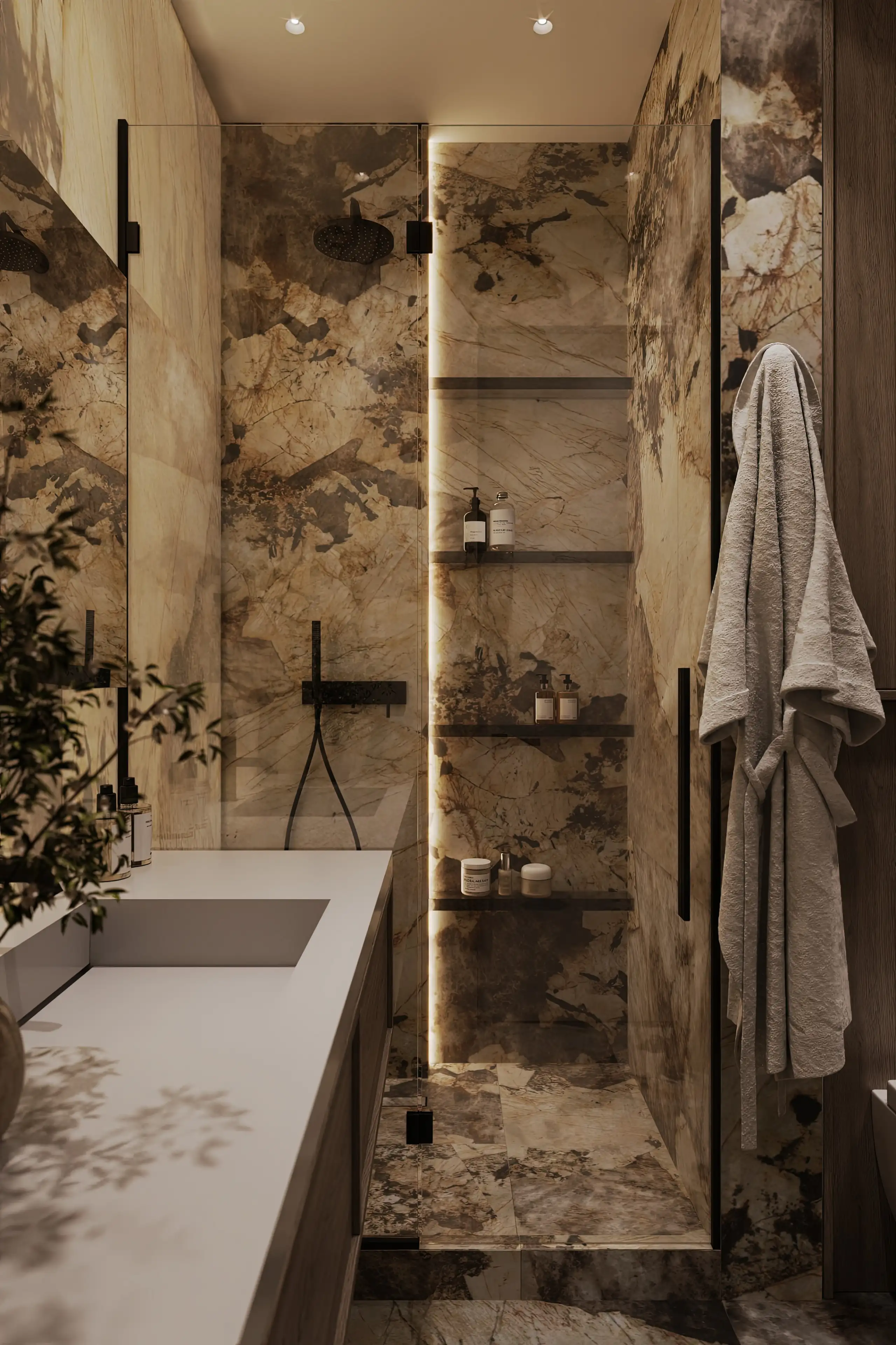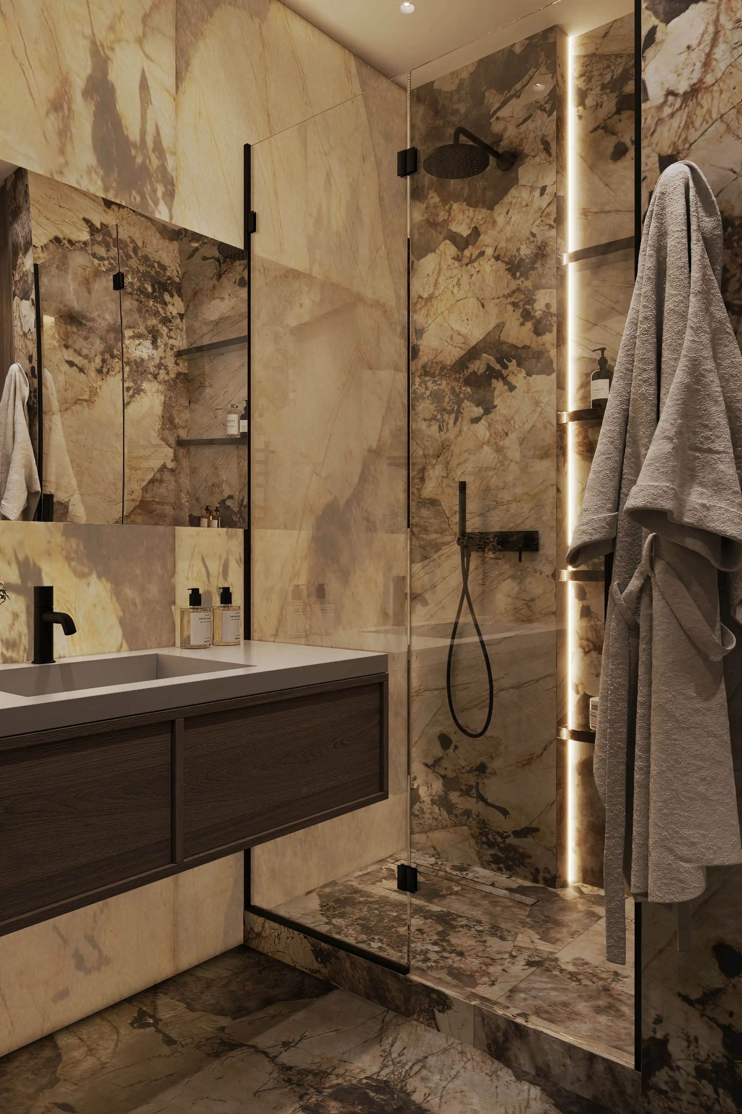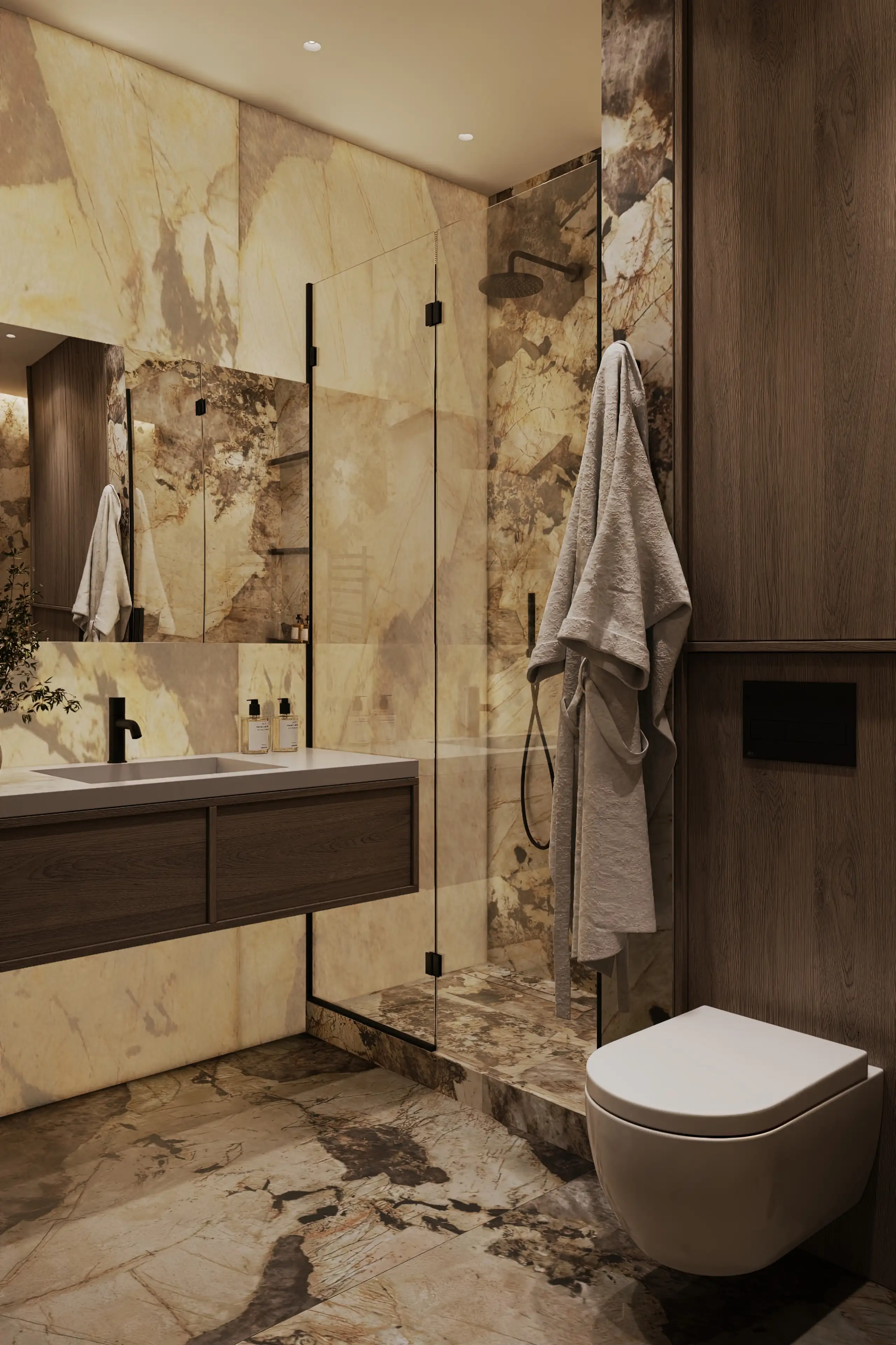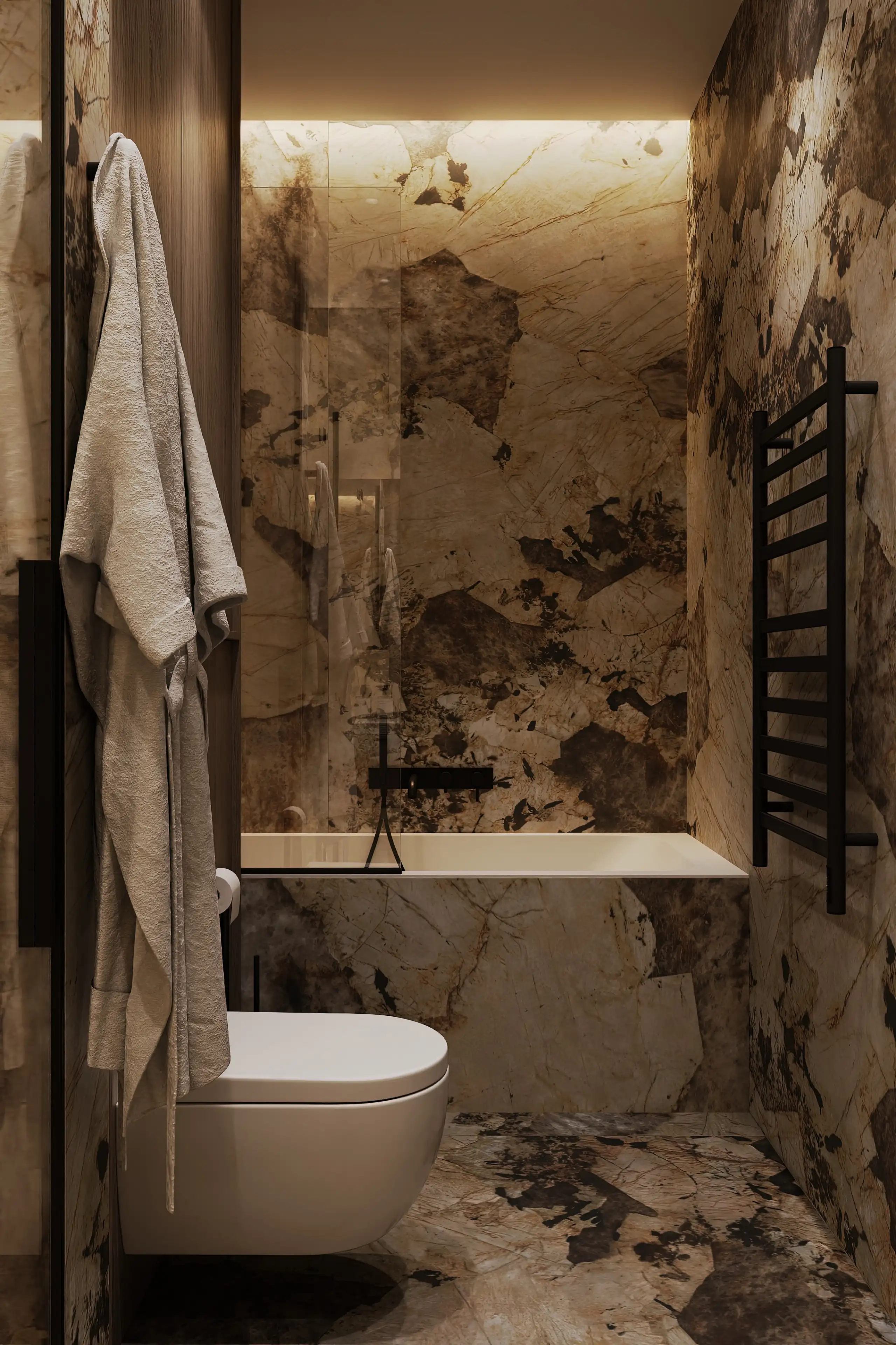 Мастер-санузел мы отделали ярким керамогранитом с выразительным природным рисунком. Его тёплые оттенки создают эффект спа-пространства.