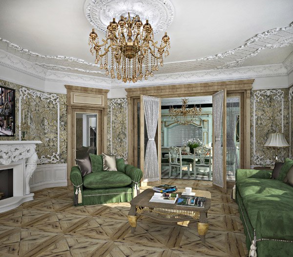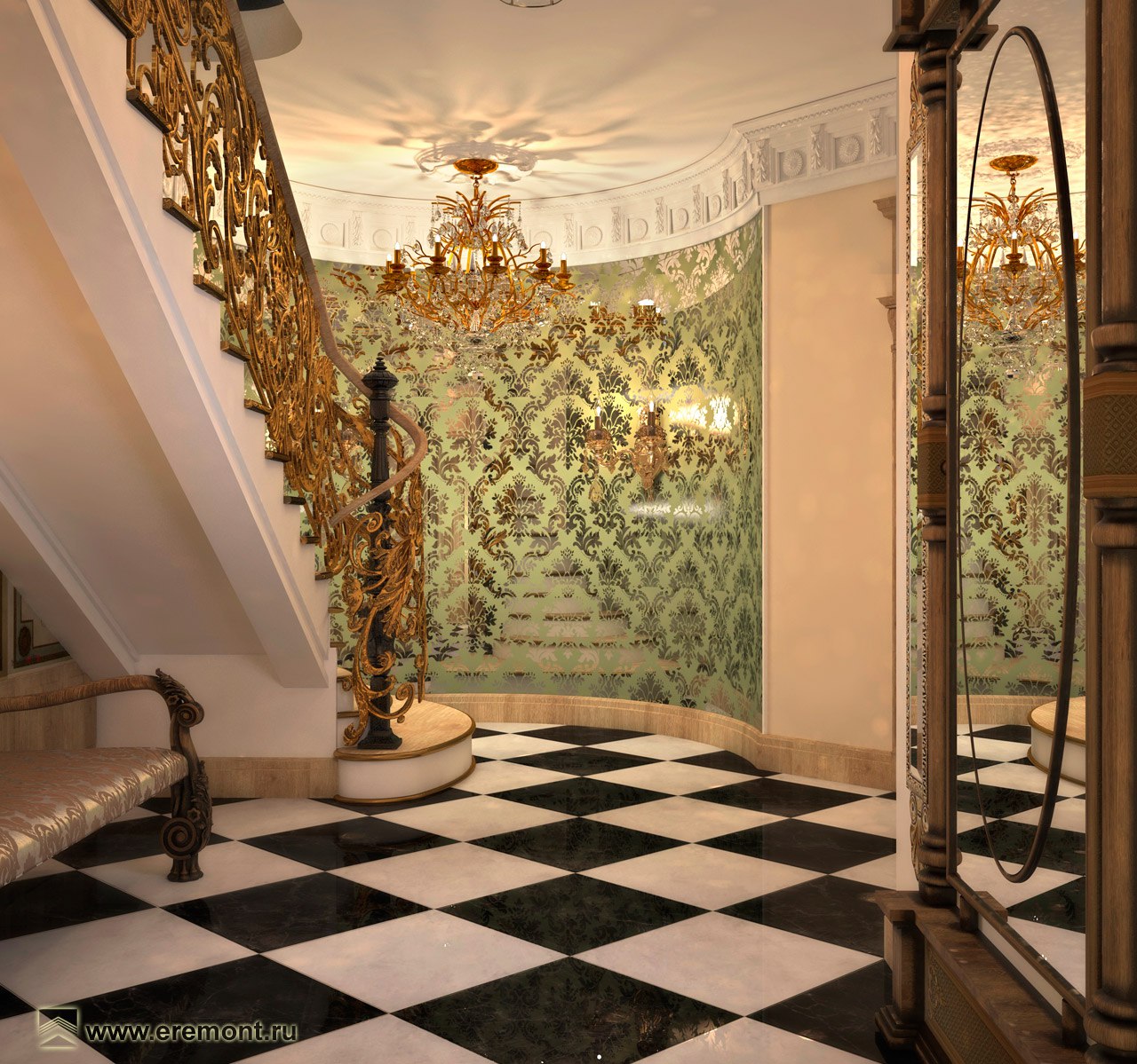 Дом представляет собой смесь классики и барокко. Первый этаж – прихожая, холл с лестницей и кухня-гостиная представляет собой как бы парадно-гостевую зону, поэтому она сделана в стиле барокко. И интерьеры получились более яркими и контрастными. https://www.eremont.ru/gallery/cottages/105-dom-klassika-barokko/