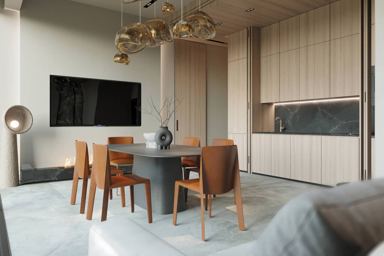 Сдержанный и спокойный характер пары повлиял на стилистику интерьера. Дизайнер предложил необычное сочетание минимализма с эстетикой японской философии ваби-саби. Это значит, что в отделке преобладают натуральные материалы, асимметрия соседствует с несовершенством природной фактуры.